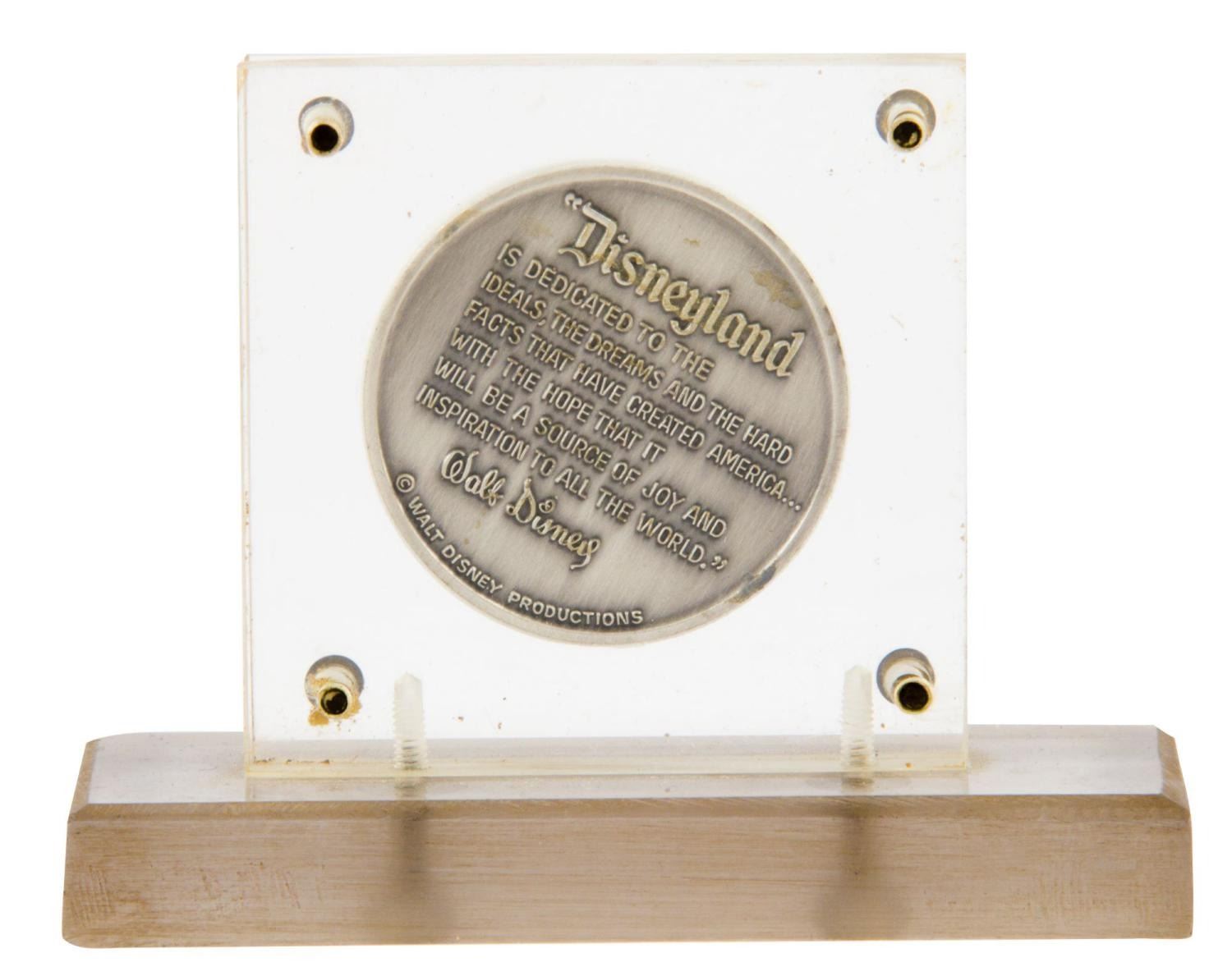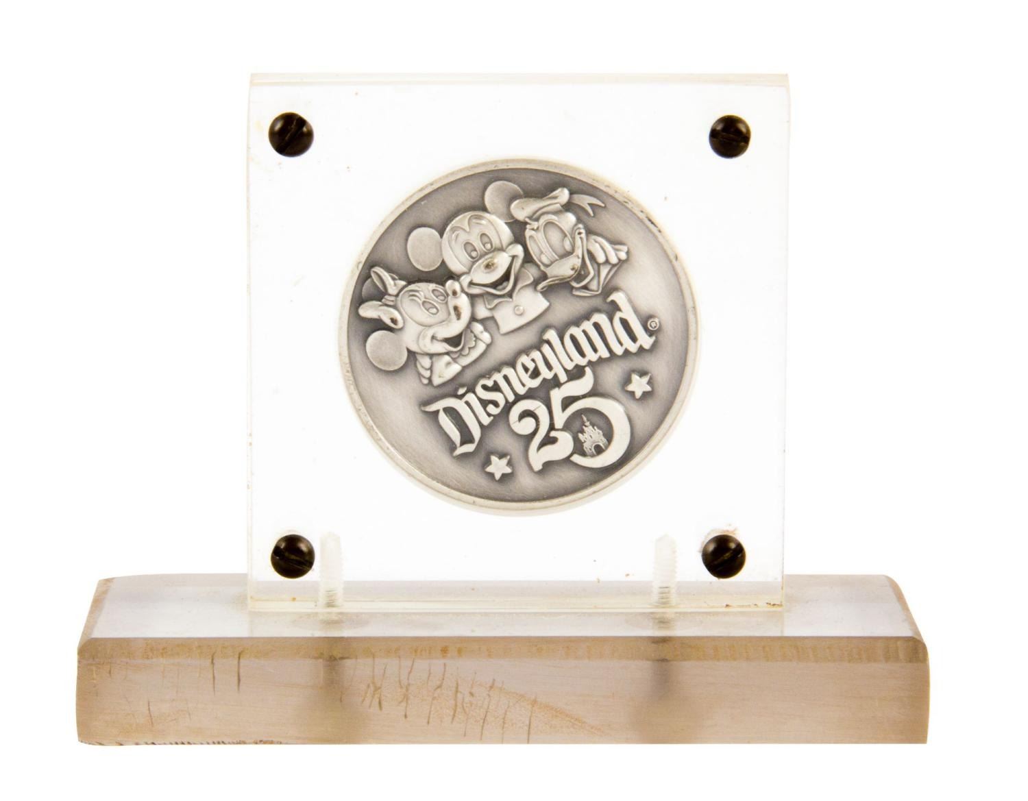 (Disneyland, 1980) A metal commemorative medallion created for Disneyland's 25th Anniversary in 1980. The front side has a beautiful dimensional image of Mickey, Minnie, and donald, and the back has a quote by Walt Disney. The medallion comes encased in a lucite stand. The medallion measures 1.5" in diameter within its 3" tall stand, and the condition is very good with some wear to the stand.