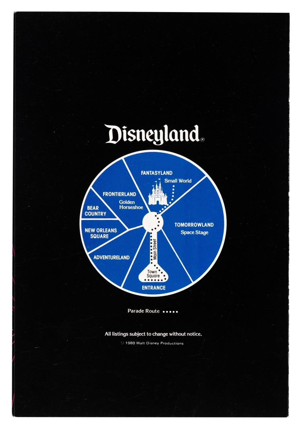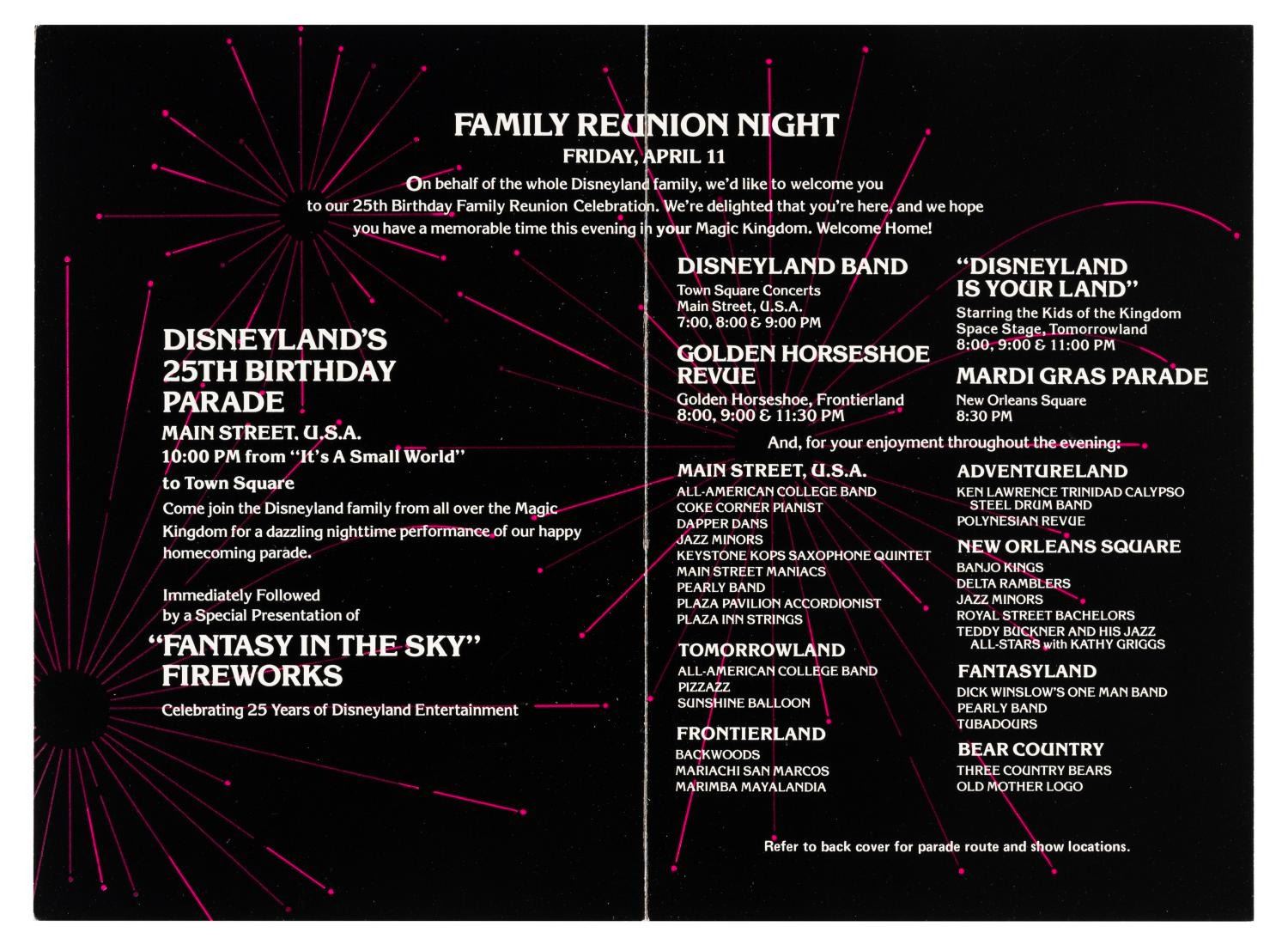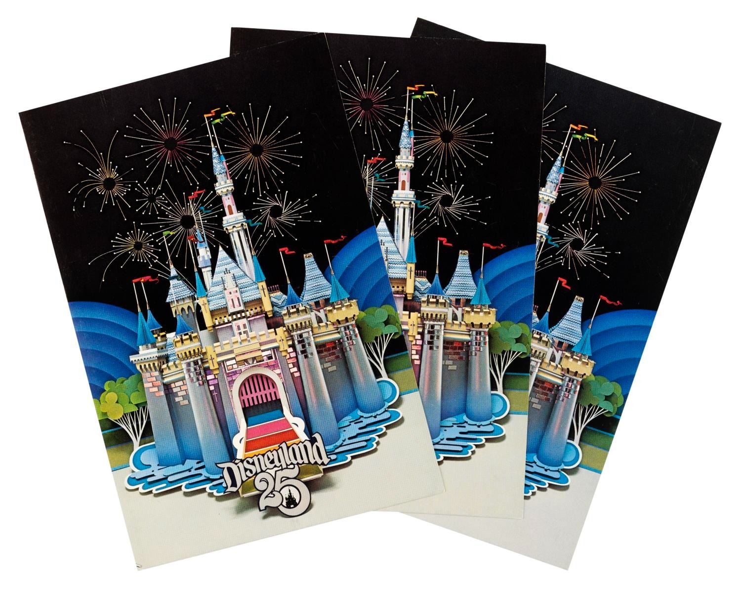 (Disneyland, 1980) A collection of three identical Family Reunion Night programs from April 11, 1980. The event was held as part of Disneyland’s 25th anniversary celebration. Measuring 5.25’ x 7.75” each, the programs display in very good condition with light scratches, smudges, and wear.