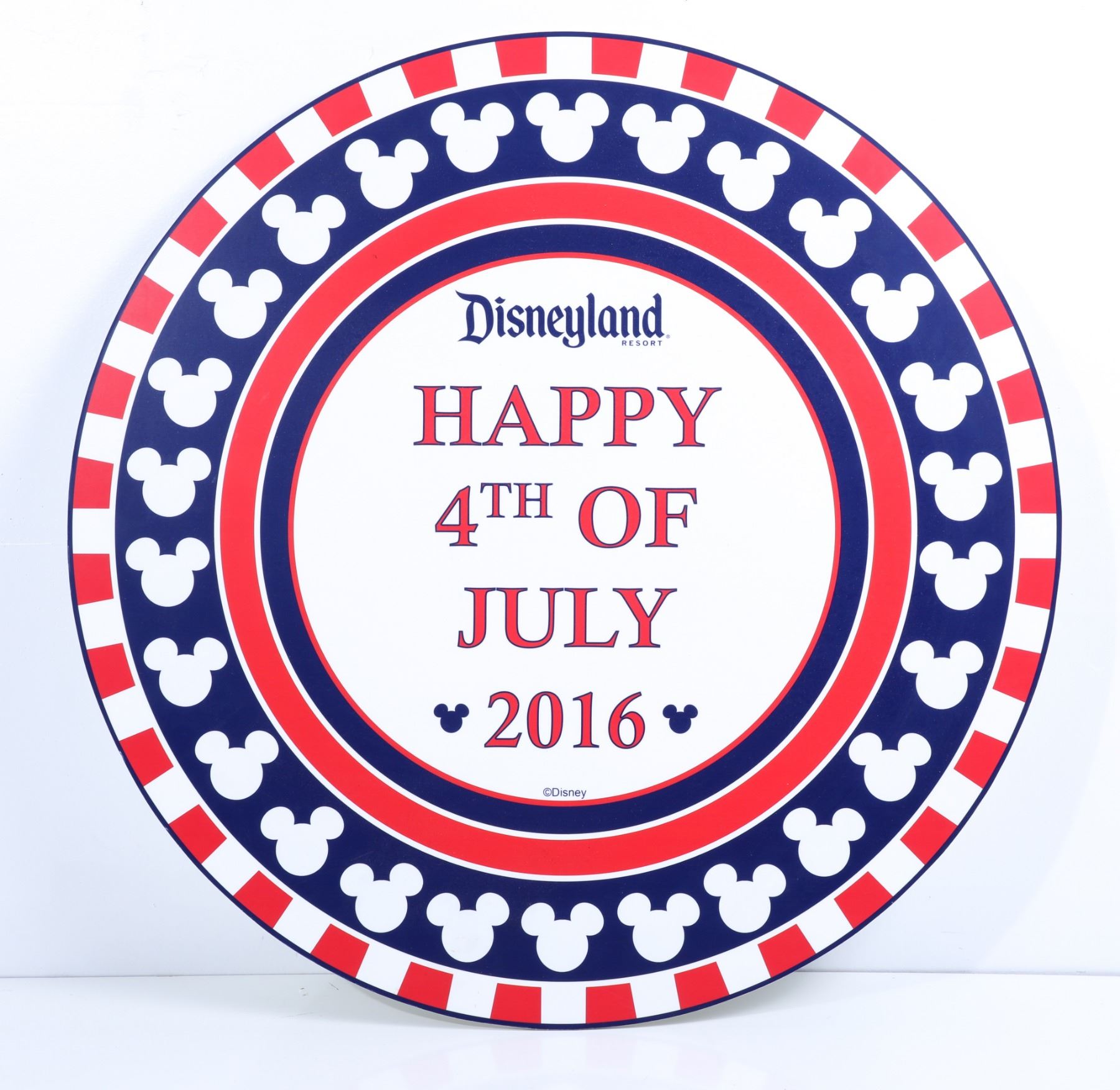 (Disneyland, c. 2016). A Disneyland park used prop sign for 4th of July celebrations in 2016. The sign is decorated in vibrant red, blue and white colors with silhouette Mickey Mouse heads circling around the sign. The sign is in good condition with normal wear from age and park use. Measures 24" in diameter. Item comes with a Grand Circle Tour Auctions COA.