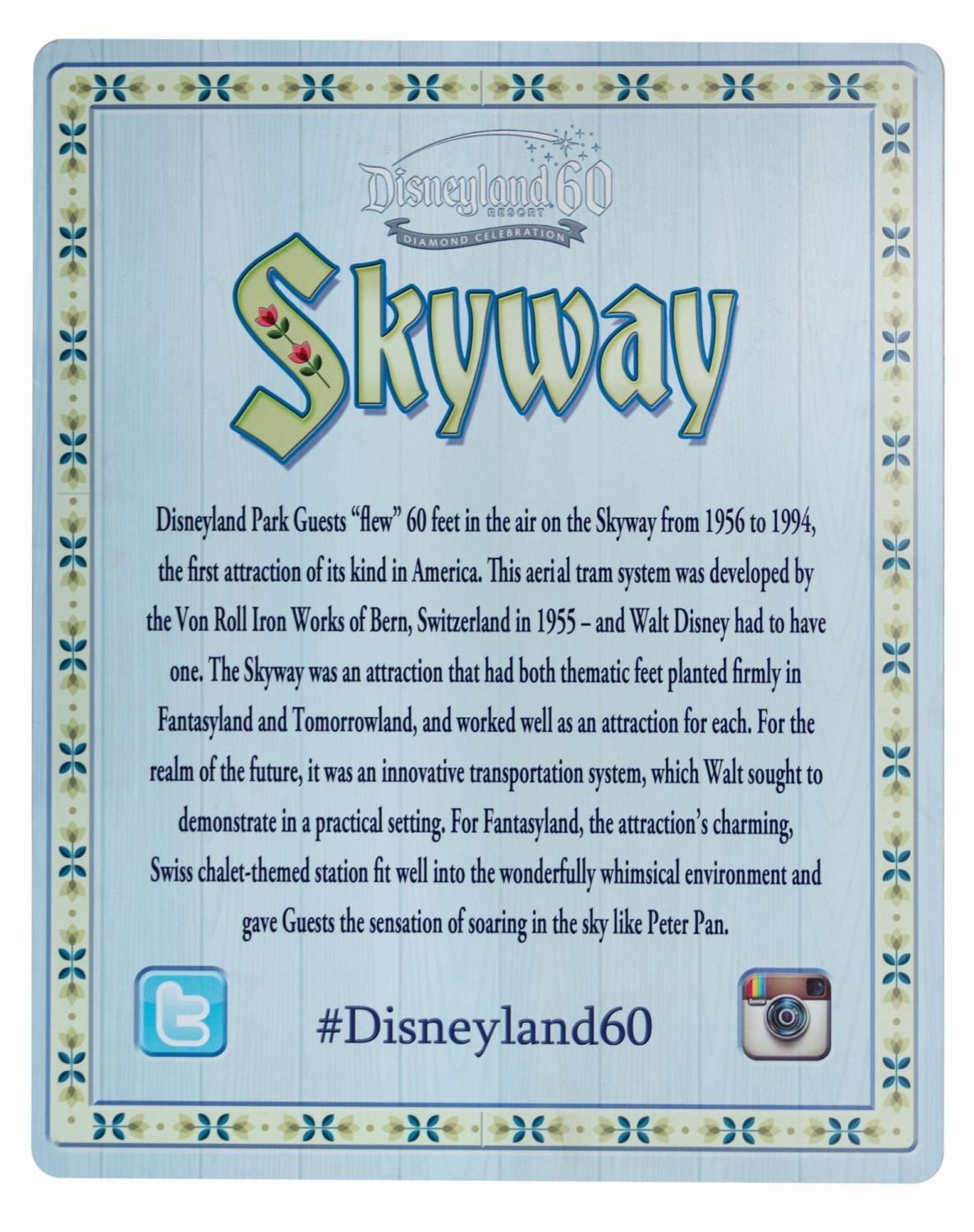 (Disneyland, 2015) A sign used during Disneyland's 60th anniversary celebration on July 17th, 2015. To commemorate the anniversary of the park's opening day, six nostalgic photo stations were set up throughout the park to celebrate popular former attractions, where guests could pose in front of an image captured in Disneyland's earlier years. Alongside those backdrops were signs like this one to describe the attraction and urge guests to share their experiences on social media. This sign is printed on PVC board and was placed in Mickey's Toontown near a backdrop of the Skyway, which closed in 1994. Measuring 29.75"x23.5", the sign is in very good condition with expected wear from park use.