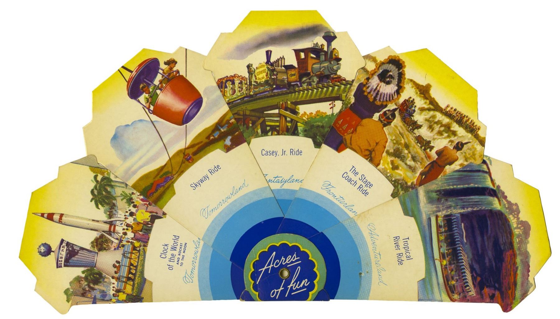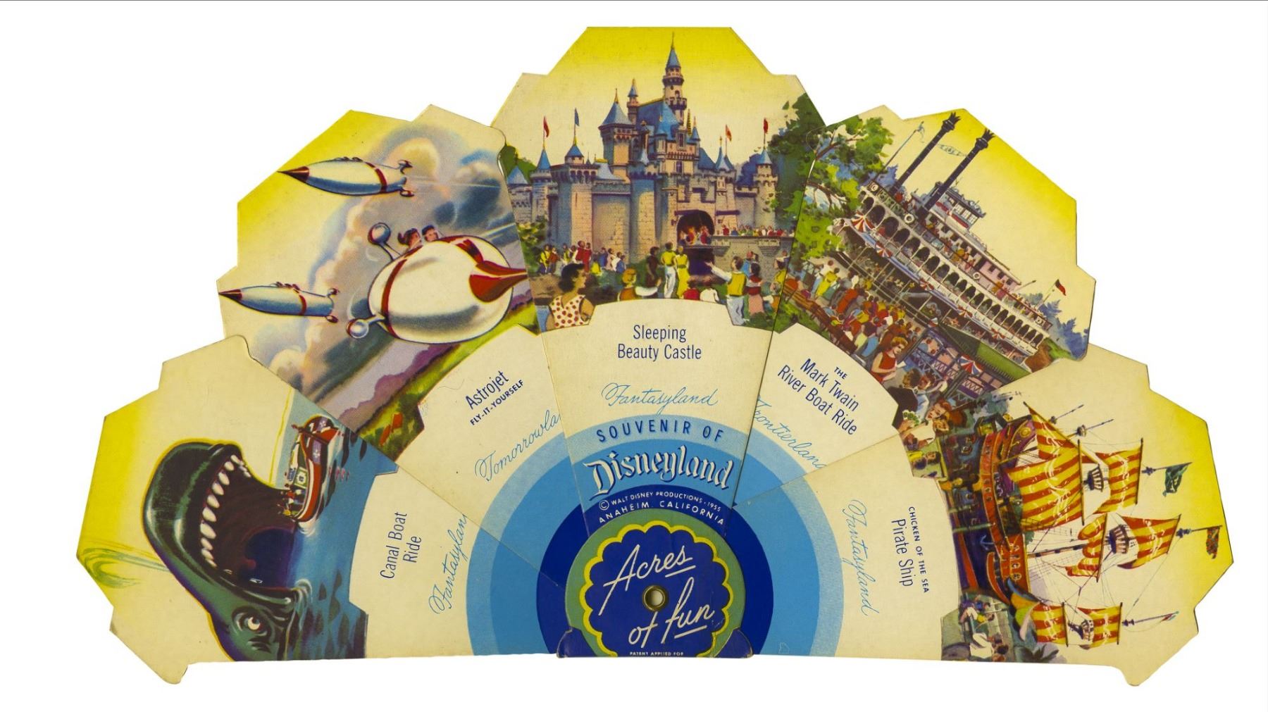 (Disneyland, 1955) A stunning piece of ephemera from the early days of Disneyland. These folding fans were sold at the many souvenir kiosks throughout Disneyland in 1955 and 1956. Lovingly illustrated on both sides with depictions of various attractions, this is a great example of the pride and care Disney put into the promotion of the park through its early souvenirs. These fans were recently re-issued as a replica by D23 as a member-only exclusive, but originals like these are extremely rare. This fan measures 6.75"x3.75" closed, and is in good condition with a few spots of discoloration and wear from use.
