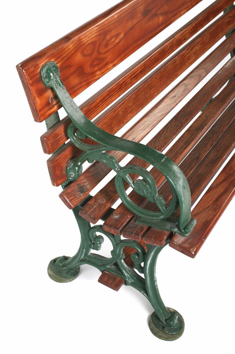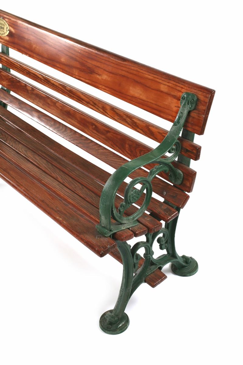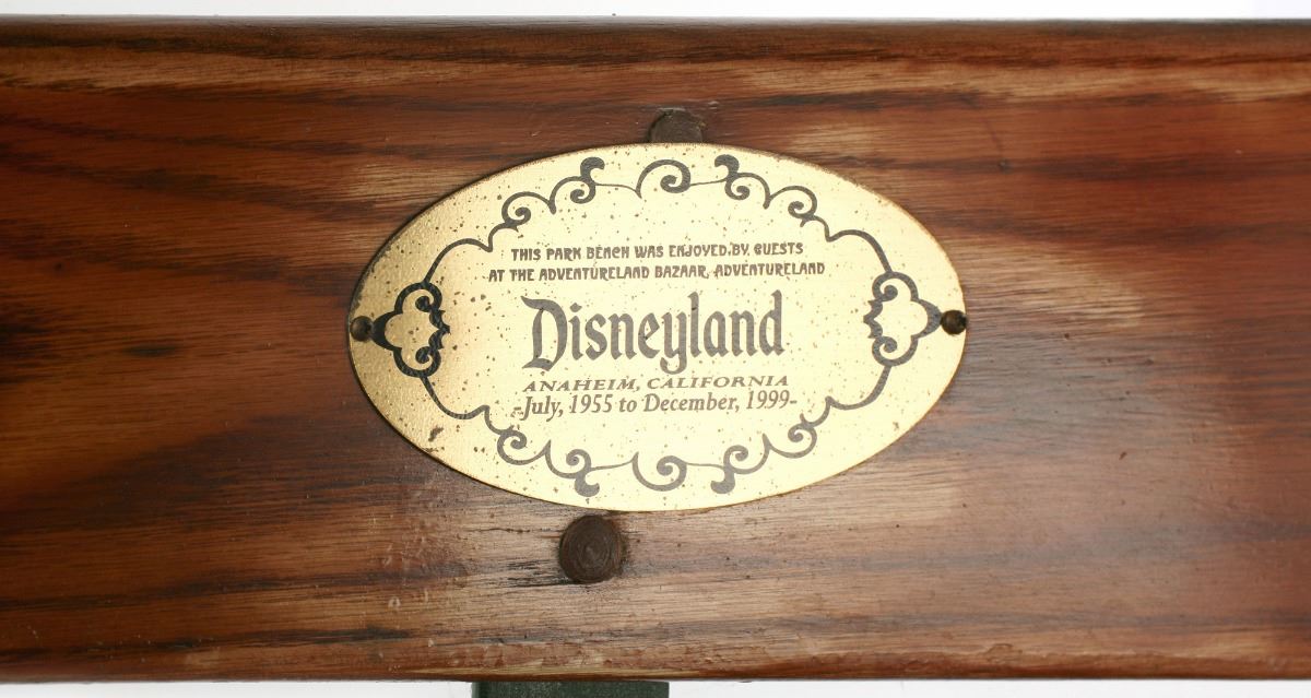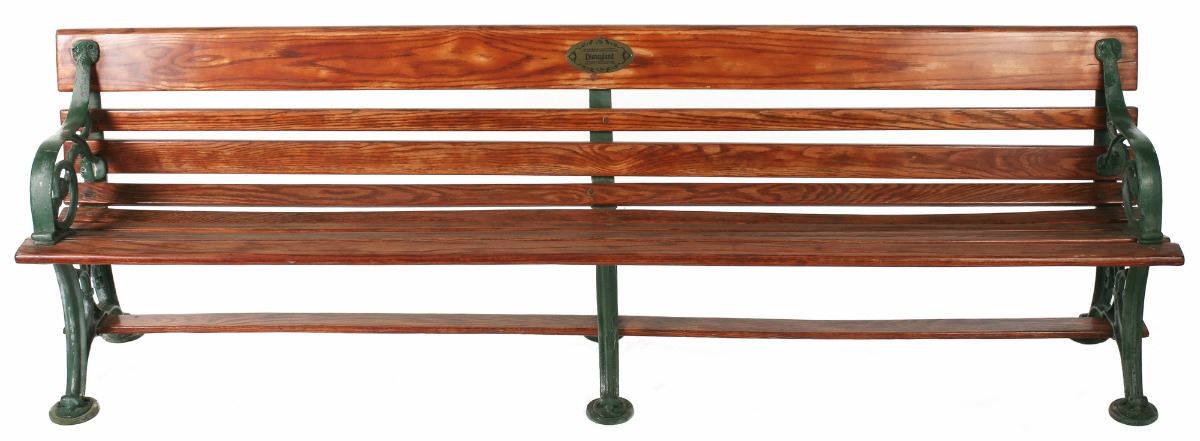 (Disneyland, 1955) From the collection of Kevin Doherty comes this incredible Disneyland park bench. While most Disneyland park benches were painted entirely green, a select few in Adventureland and Frontierland remained a natural wood color. This bench occupied a place at the Adventureland Bazaar for almost 44 years, and the original cast iron and wood bench has been lovingly restored to its original Adventureland luster. A commemorative plaque has been added that reads "This park bench was enjoyed by guests at the Adventureland Bazaar, Adventureland. Disneyland Anaheim, California July, 1955 to December, 1999". Measures approximately 8' long and 32" high. In fine condition.