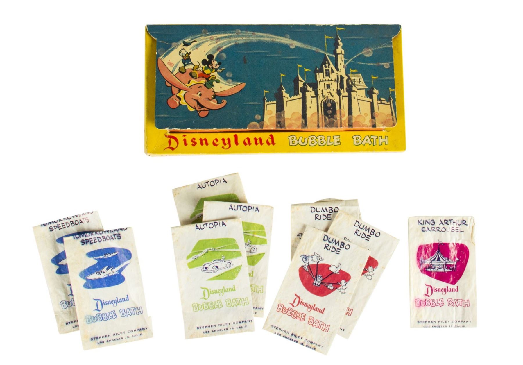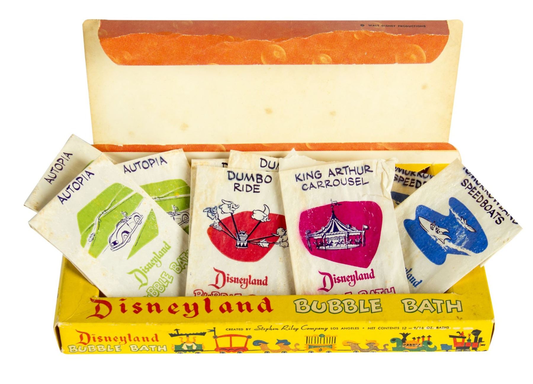 (Disneyland, 1955) A rare box of Disneyland attraction bubble bath. The original box contains nine packets of attraction-themed bubble bath. The set includes packets for "Autopia", "Dumbo", "Tomorrowland Speedboats", and a packet for the "King Arthur Carrousel." The original box measures 5"x9.25" and 1.25" thick. The set is in very good condition, with some wear to the box. Small amounts of the bath powders remain in the packets, which have spots of discoloration throughout from the powders.