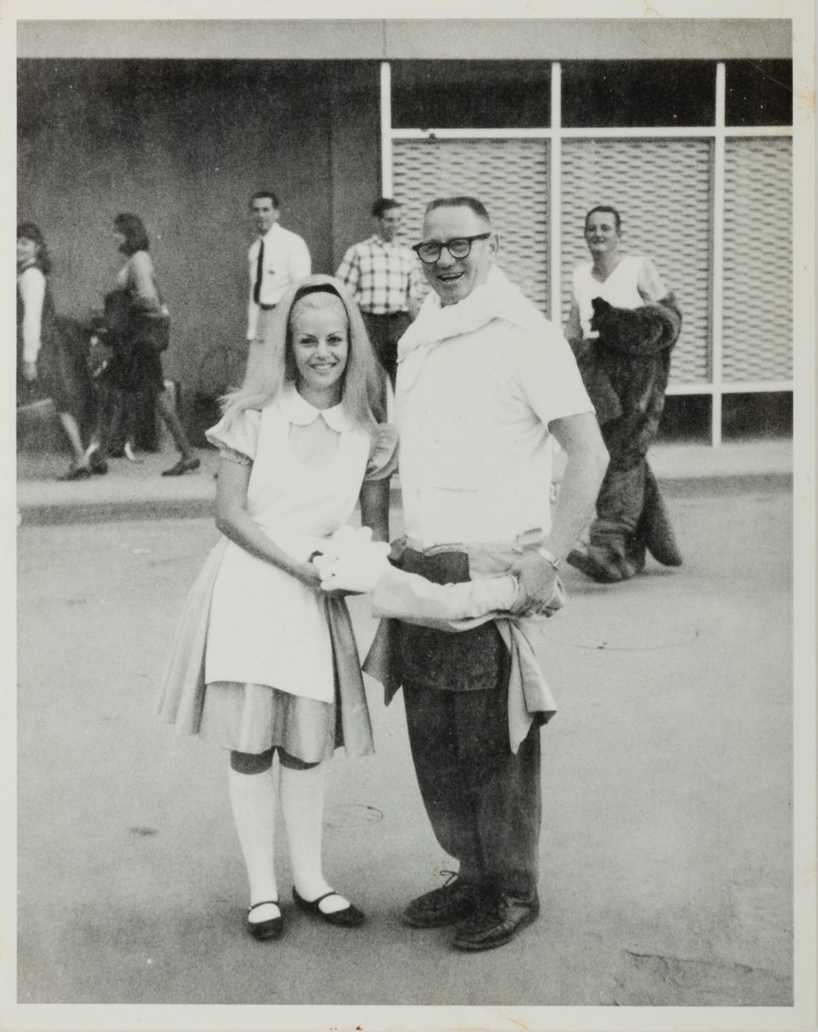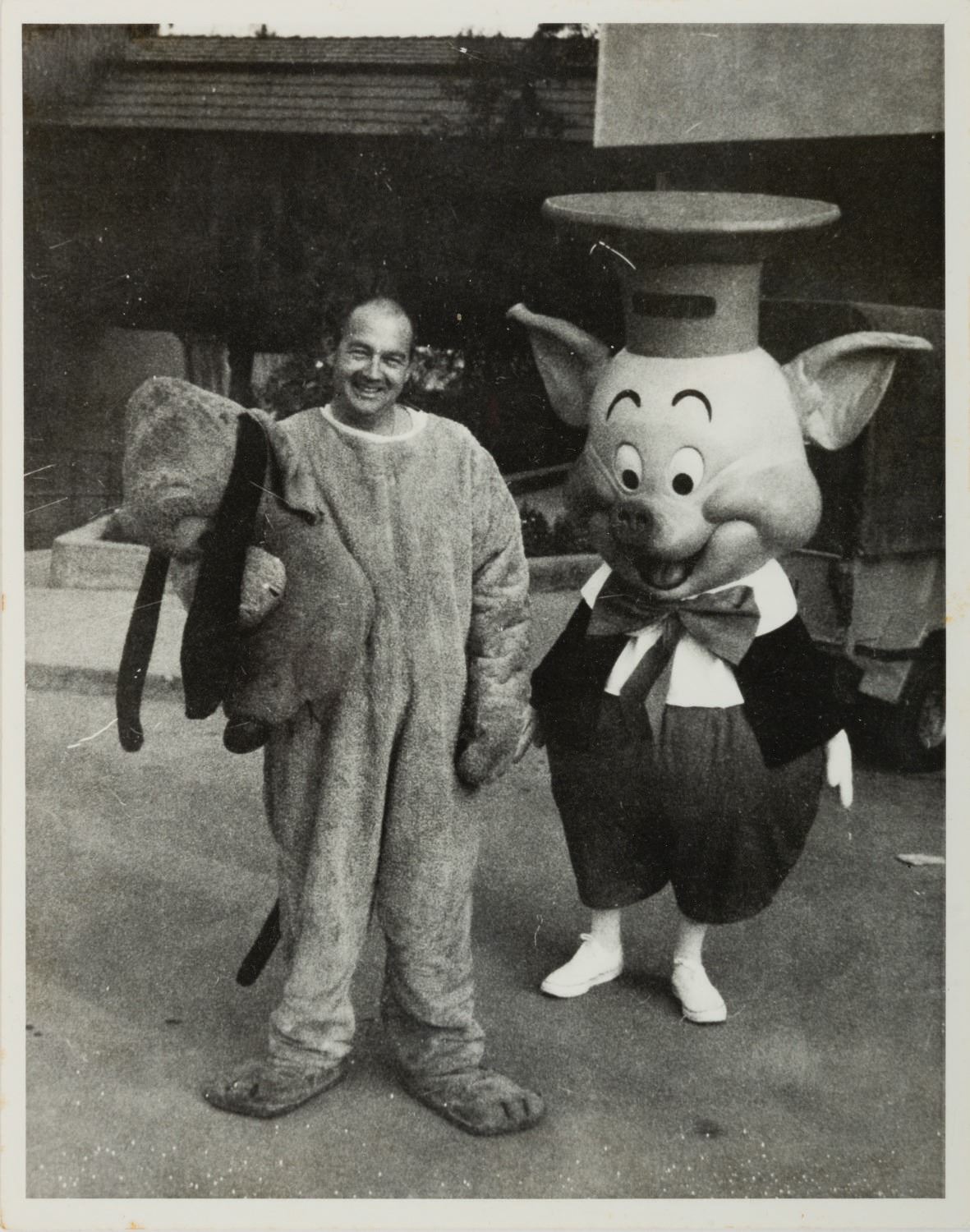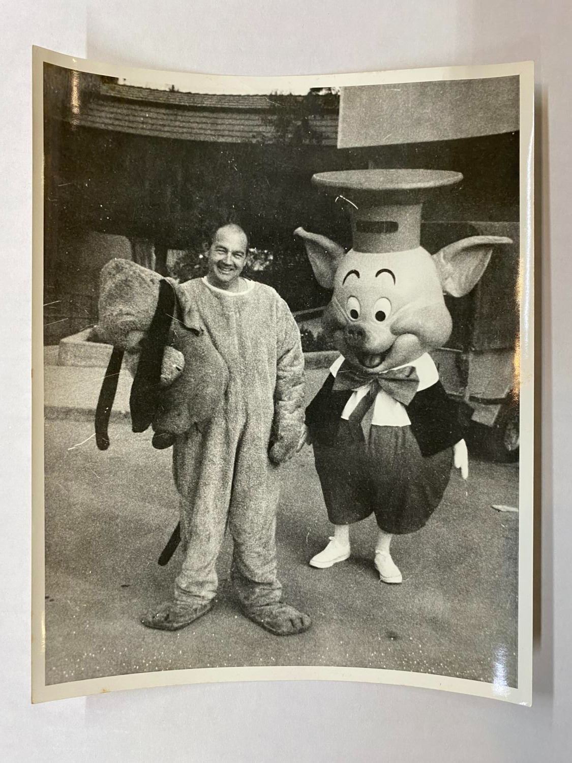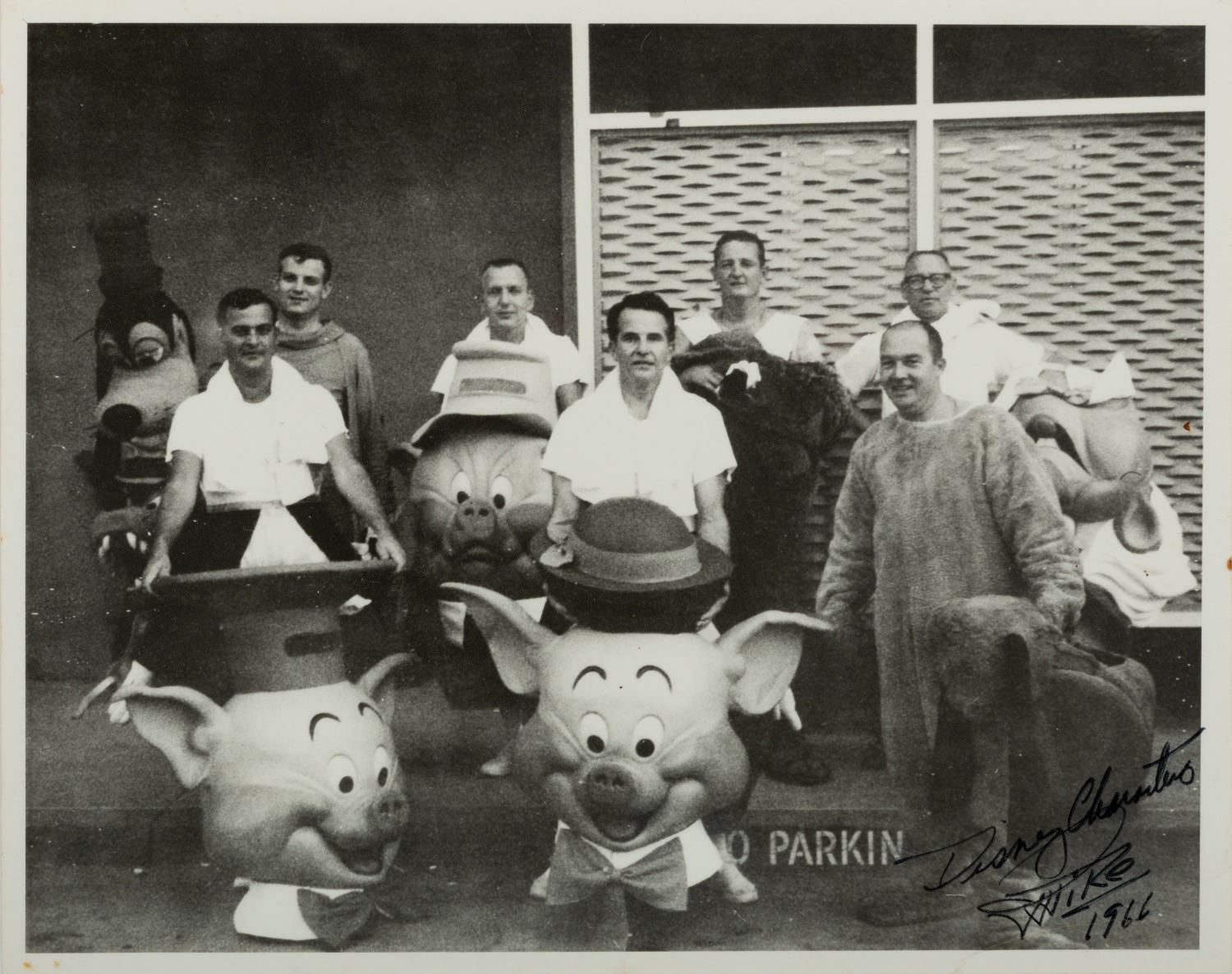 (Disneyland,1967-1968) A rare collection of photos depicting Disneyland Operations Managers and Supervisors stepping into the role of Entertainment Division Disneyland Characters. Notably seen among the group is Fantasyland Manager Bill Sullivan (in the role of Pluto) and Disneyland Mechanical Manager Arnold Lindberg (as the Mad Hatter) and MIke Dean Vance of Disney University (pig costume on the left) who has also signed the photo. Measuring 8"x10" the photos are in very good condition, despite minor curling, and slight wear to corners and edges.