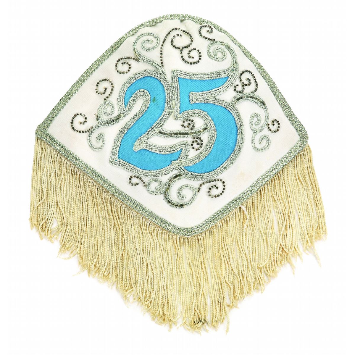 (Disneyland, 1980) A rare shoulder eplet from a band performers costume, this piece was used during the celebration of Disneyland’s 25th anniversary. Made of a highly decorated cloth in blues and silvers with tan fringe. Measures 9.5”x10”. In very good condition, with a small faint 0.25” stain on the blue “2”.