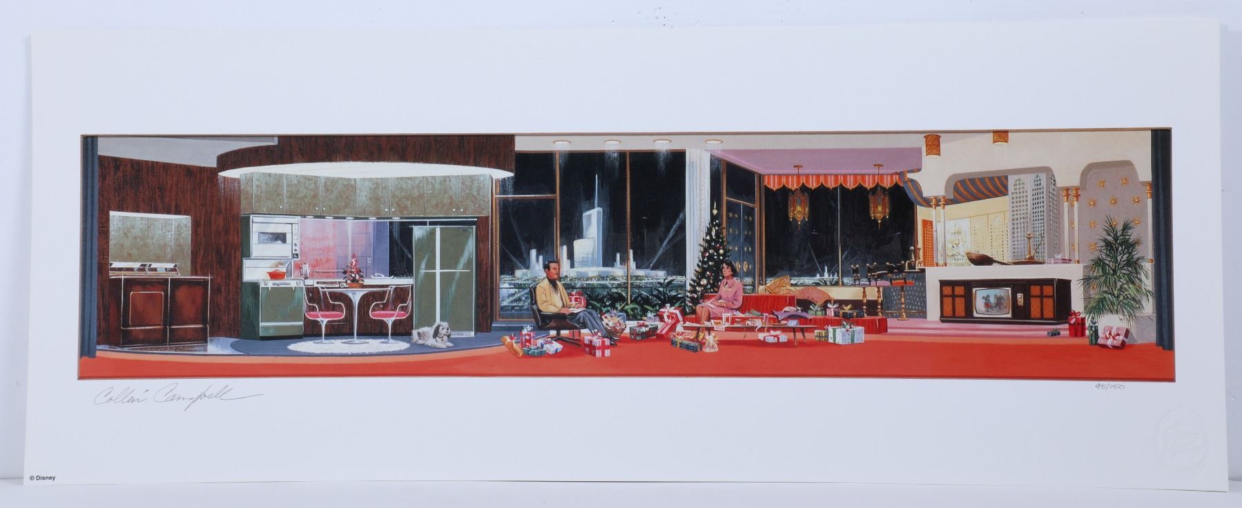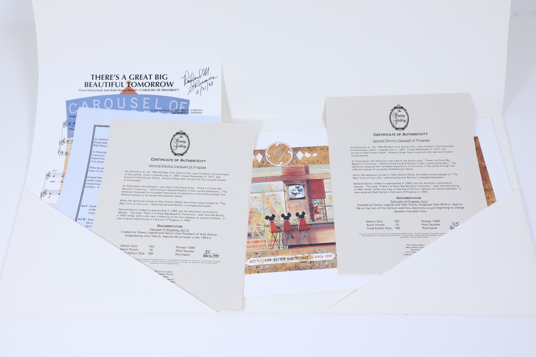 (Disneyland, Disney Gallery, c. 1998). A rare set of Disneyland Carousel of Progress limited edition concept art lithographs signed by several of the original artists including Sam McKim, John Hench and Collin Campbell and sheet music for the attraction song "There's a Great Big Beautiful Tomorrow" signed by Richard Sherman. Composers, and brothers, Richard and Robert Sherman composed this original music. The Carousel of Progress had its world debut at the 1964-65 New York World's Fair as one of several Walt Disney attractions that featured the greatest advancements in audio-animatronics at its time. There are four featured lithographs of Carousel of Progress concept art and each signed by an original Disney Legend and Artist, and numbered #95 of 150. The lithographs and sheet music are in condition with normal wear from age and minimal handling. Item comes with a Grand Circle Tour Auctions COA.