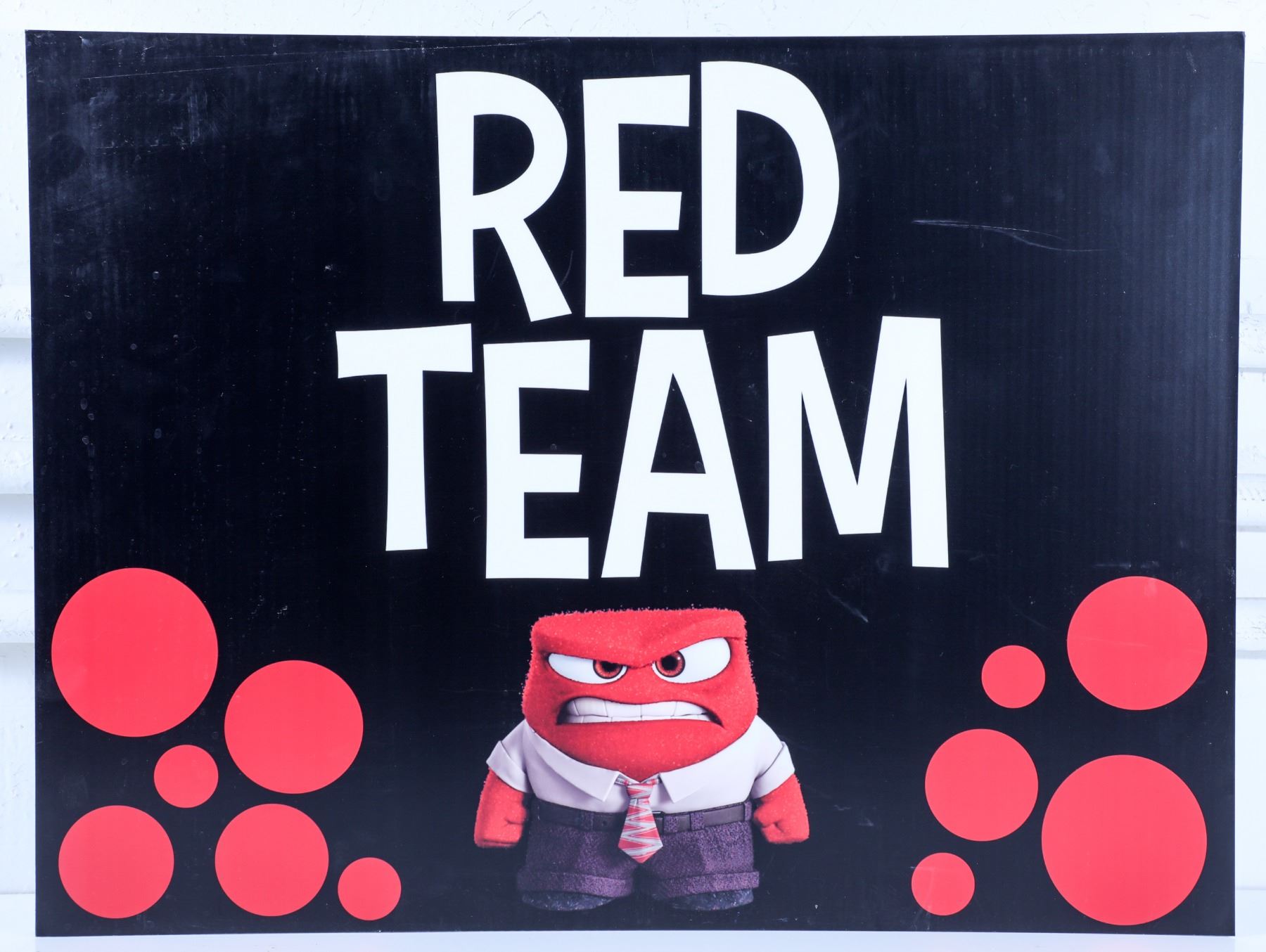 (Disneyland, c. 2015). A Disneyland parked used sign for the cast member canoe race. The sign is for the Red Team and has the character Anger from the Disney Pixar film "Inside Out.". The sign is in good condition with normal wear from age and park use. Measures 24" x 18". Item comes with a Grand Circle Tour Auctions COA.