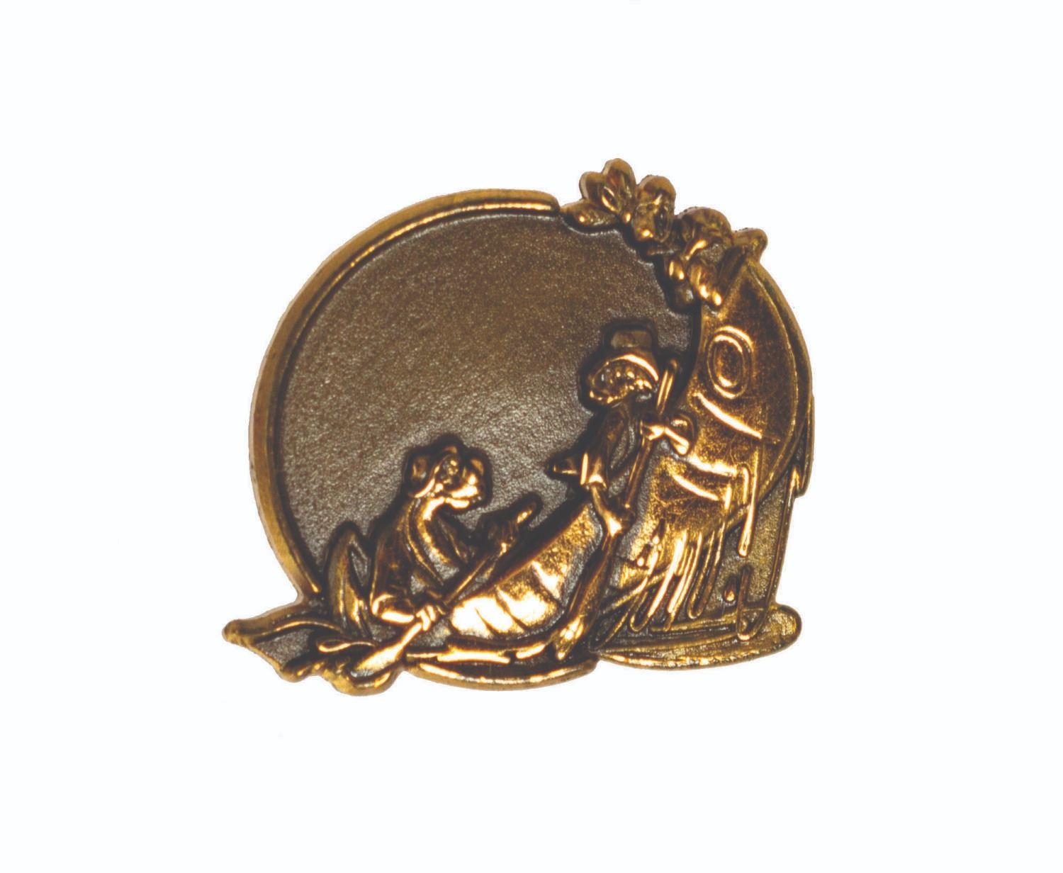 (Disneyland, 1986) A commemorative pin given to participants of the cast member canoe races. The pin comes in its original plastic box. Interestingly, it lacks the engraved "1986" on the reverse which is often seen on these pins. Measuring approximately 0.5"x0.5", the pin is in fine condition, being as-new.