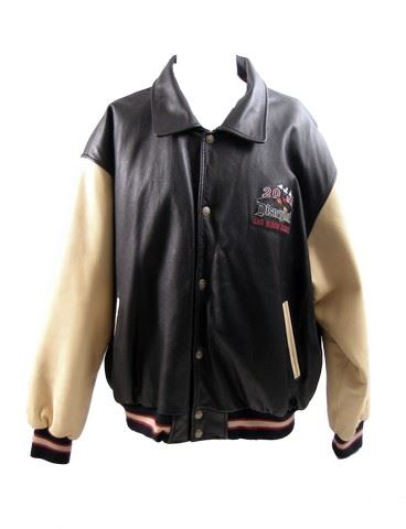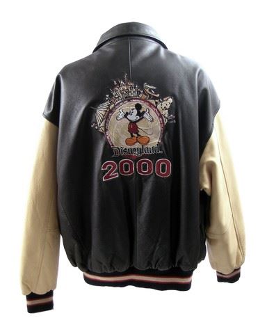 Black and tan leather long sleeve button front with 2000 Disneyland Cast Member Millennium logo on the front and back 'Disneyland' jacket. This was given out to employees of the theme park participating in special park events. (size 3XL)