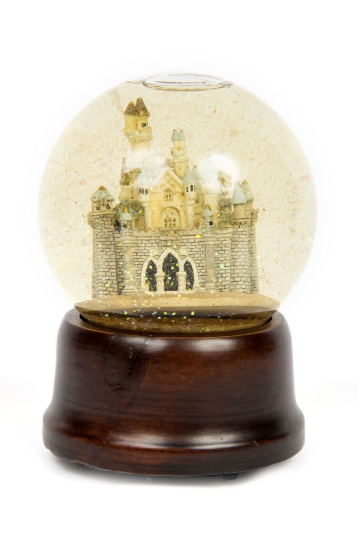 (Disneyland, c.1980s) An original souvenir musical snow globe from Disneyland that plays "When You Wish Upon a Star". The snow globe depicts Sleeping Beauty Castle and still retains its original water and glitter. The wind-up music box in the base still functions, and the front of the wooden base has a metal "Disneyland" plaque. Measuring 5.5" tall, the snow globe is in very good condition with some minor wear from light use.