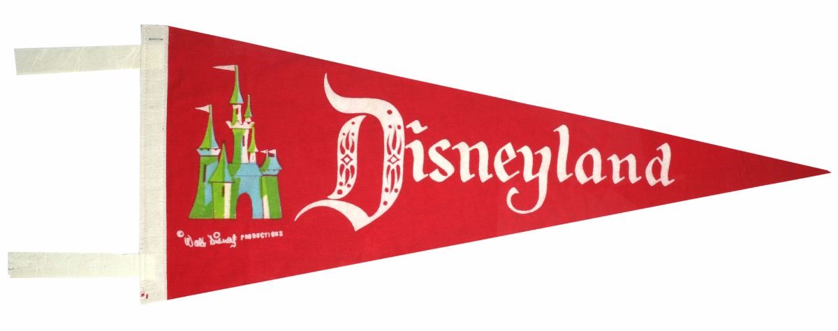 (Disneyland, 1960s) Red pennant with white lettering and imagery of Sleeping Beauty Castle. Measures 9.25"x24". In good condition with some creasing.