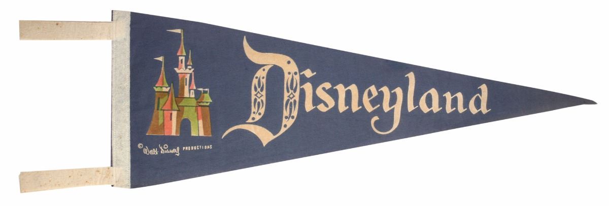 (Disneyland, 1960s) Blue pennant with off-white lettering and imagery of Sleeping Beauty Castle. Measures 8.5"x23.5". In good condition with some wear throughout.