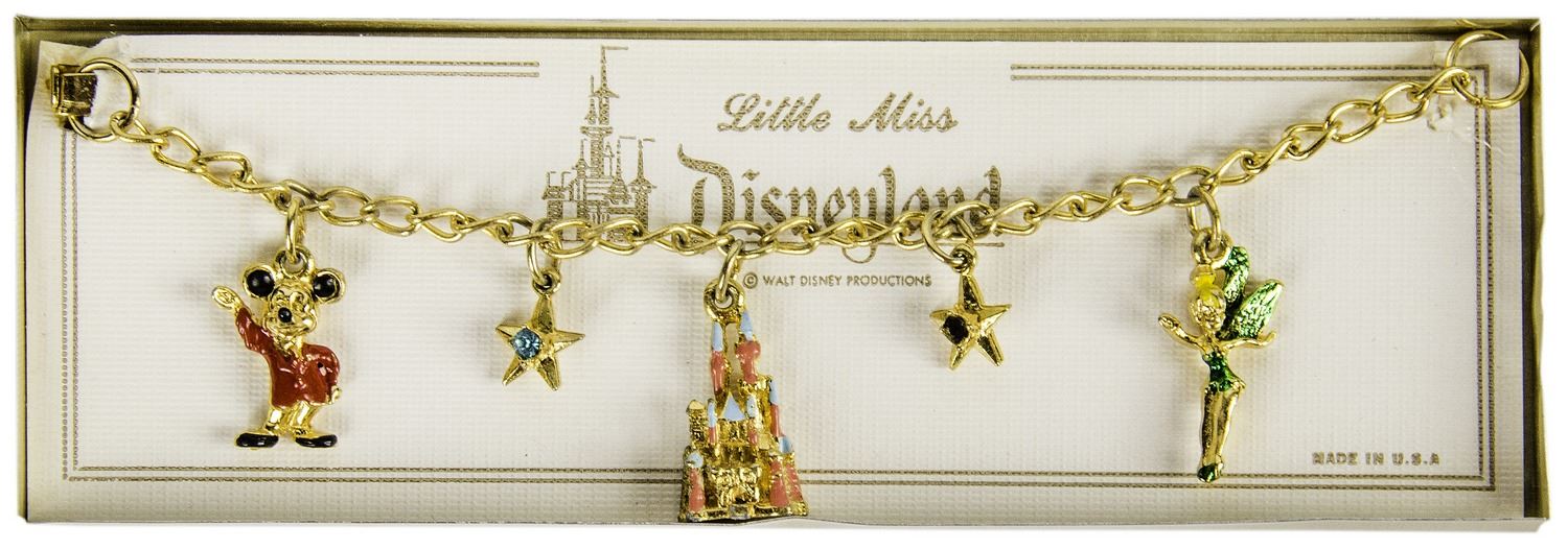(Disneyland, 1960s) A beautiful charm bracelet featuring (5) Disneyland-themed charms within its original packaging. This "Little Miss" Disneyland charm bracelet depicts Mickey Mouse, Sleeping Beauty Castle, and Tinker Bell, and the measures approximately 6" long. This item is in very good condition, with light wear to the box.