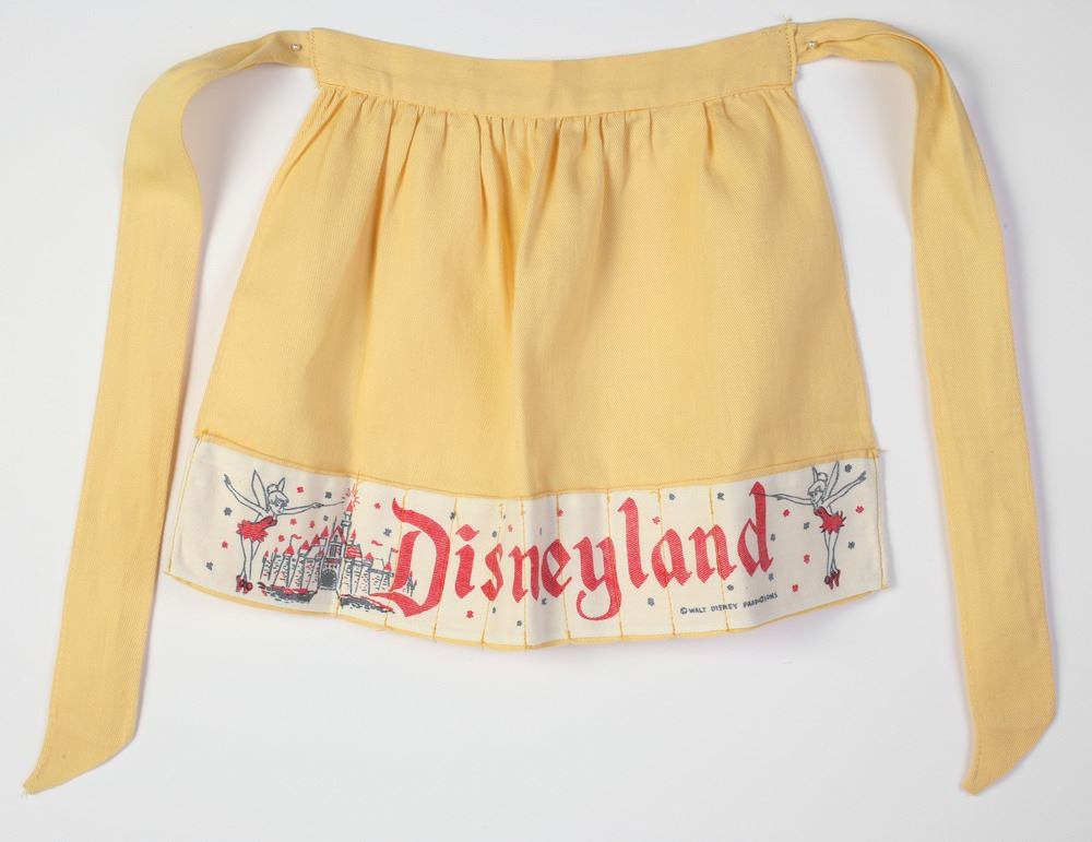 (Disneyland, 1950s) Yellow child's apron with pockets to hold crayons for protecting the child's clothes. "Disneyland" largely written on the front. Measures approximately 13.5"x15.5". Apron is in good condition with minor wear.