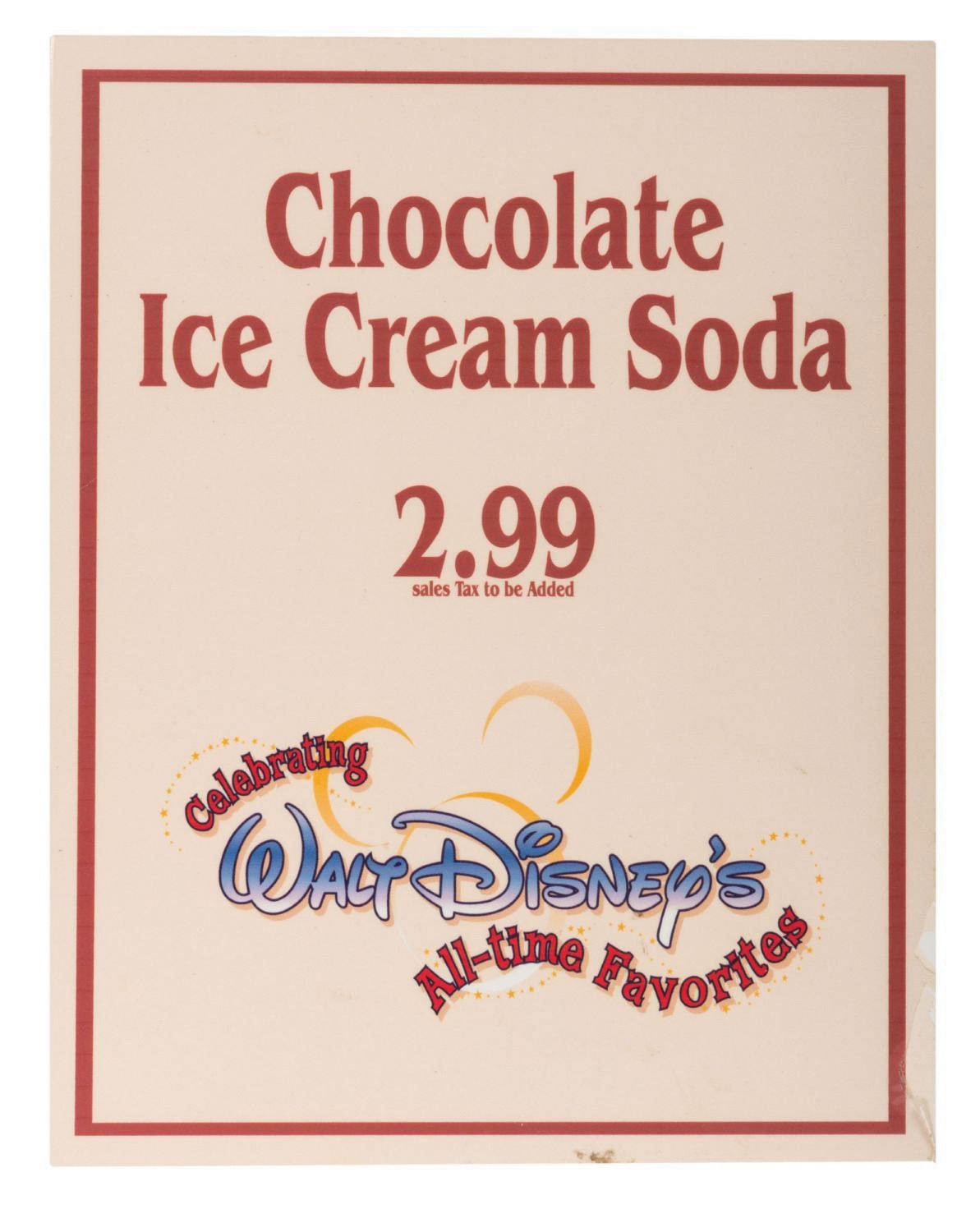 (Disneyland, c.2000s) A Park-used chocolate ice cream soda sign. The sign advertises one of "Walt Disney's All-Time Favorites," for guests of the Disneyland Resort. Measuring 10"x8", the pvc board sign displays in very good condition with minor wear and spots of peeling to the face.