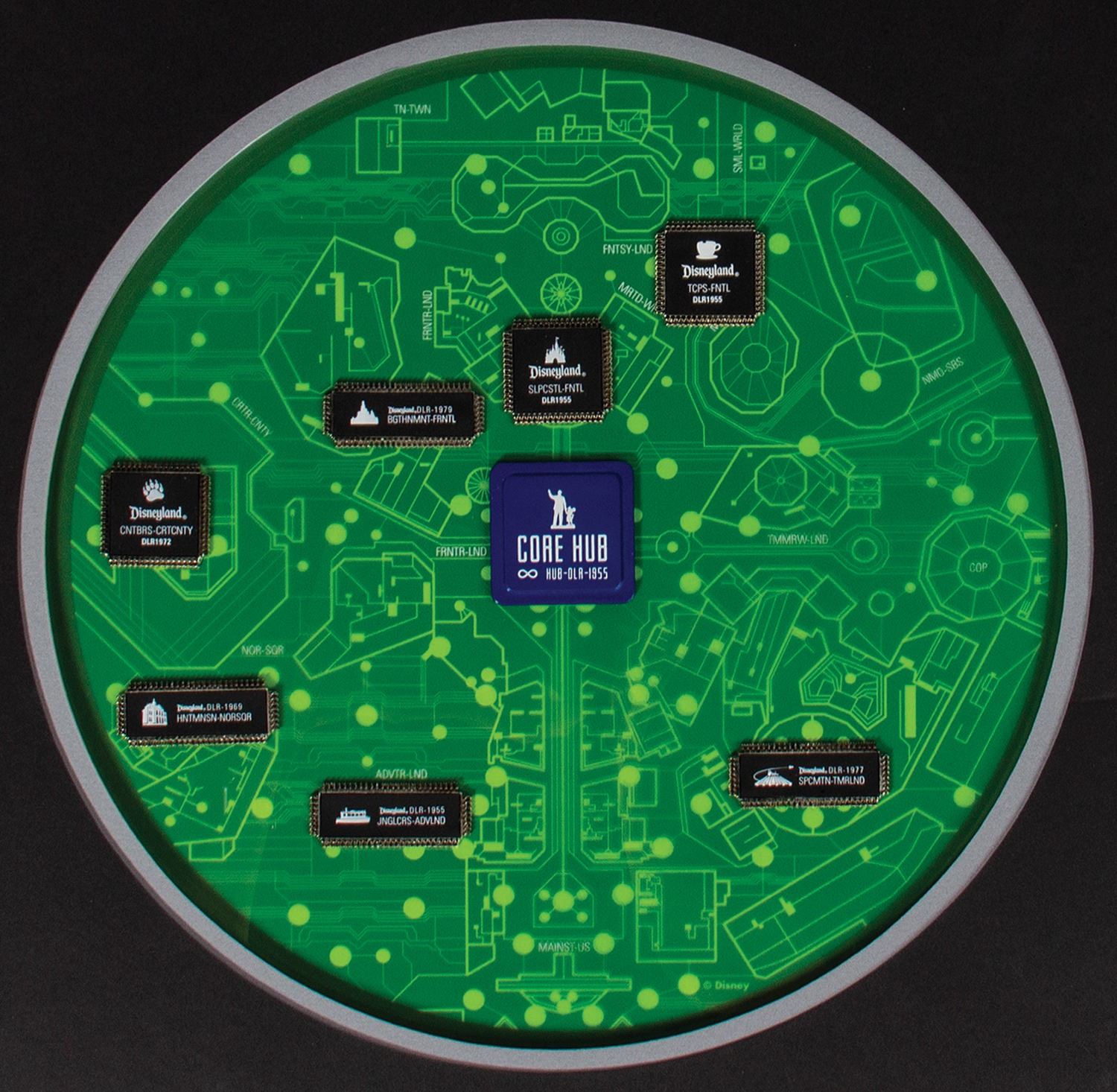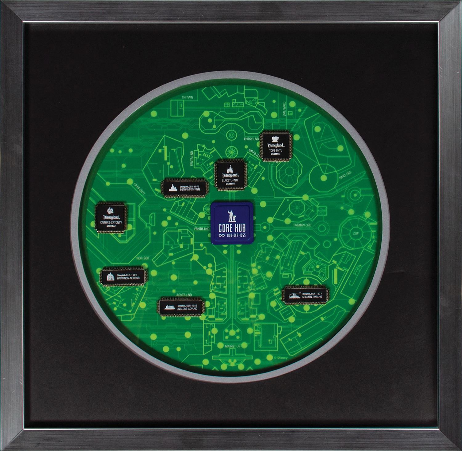 (Disneyland, 2011) A framed pin set created by Disney artists Mike Sullivan and Chris Chapman in a limited edition of only 150. Titled "Circuit Board Park Map Frame Set," the artwork recreates a map of Disneyland in a circuit board design, and includes (8) pins featuring the "Core Hub," Mad Tea Party, Sleeping Beauty Castle, Big Thunder Mountain Railroad, Country Bear Jamboree, Haunted Mansion, Jungle Cruise, and Space Mountain. The framed set measures 15.75"x15.75" and the original COA is included on the reverse of the frame. The condition is very good with some frame wear from previous display, and minor bending to the mat near the right center.