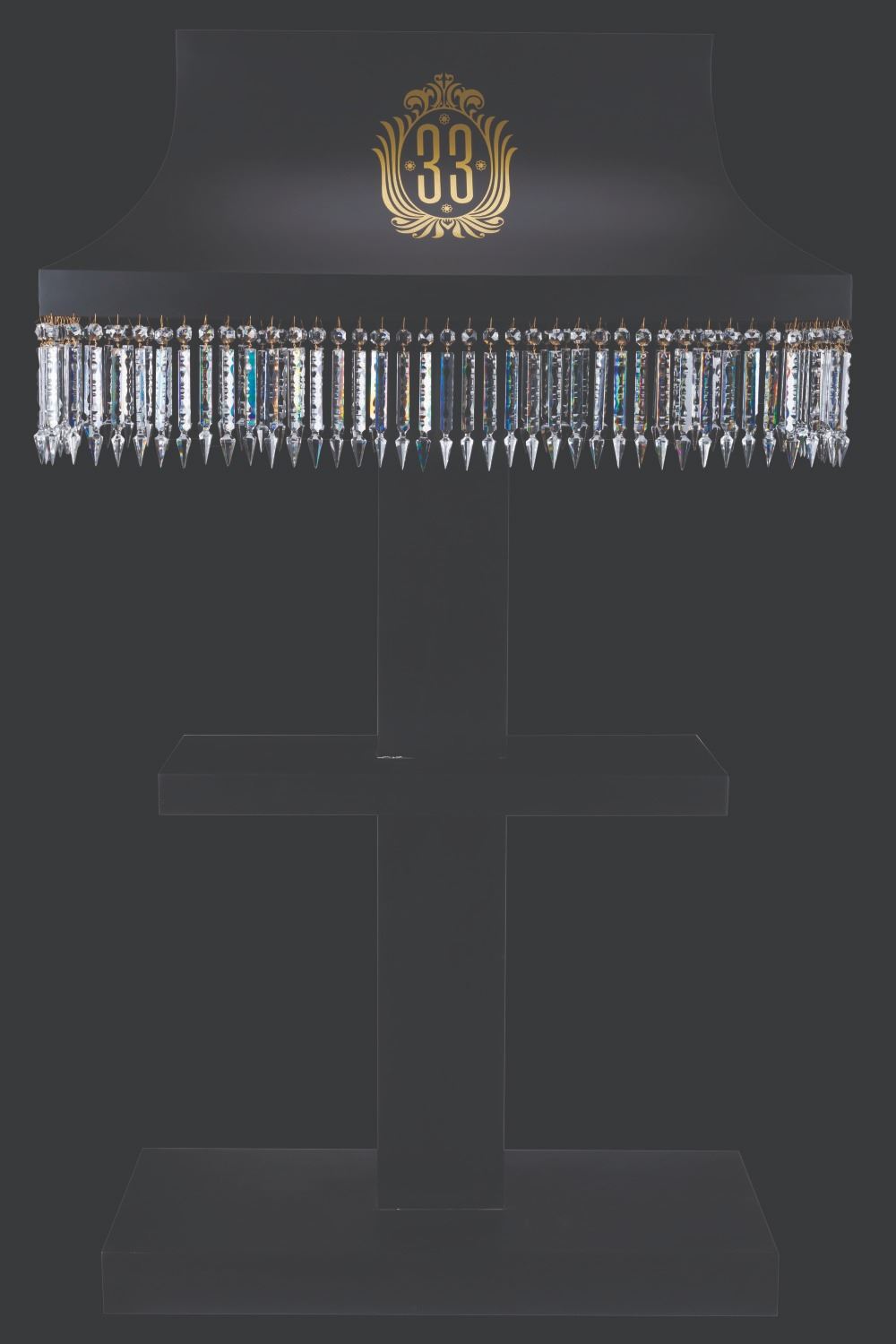 (Disneyland, 1990s-2000s) A collection of 104 glass crystals from Club 33, presented in a custom display. The glass crystals used to hang above a bar at Club 33, Disneyland’s very exclusive dining club. Measuring 8” each, and 9” with hooks, the crystals are in very good to fine condition with light scratches, scrapes, wear from Park use, and chips on some crystals. The 46.25” x 76” x 19” deep custom display is in very good condition with light scratches and wear.
