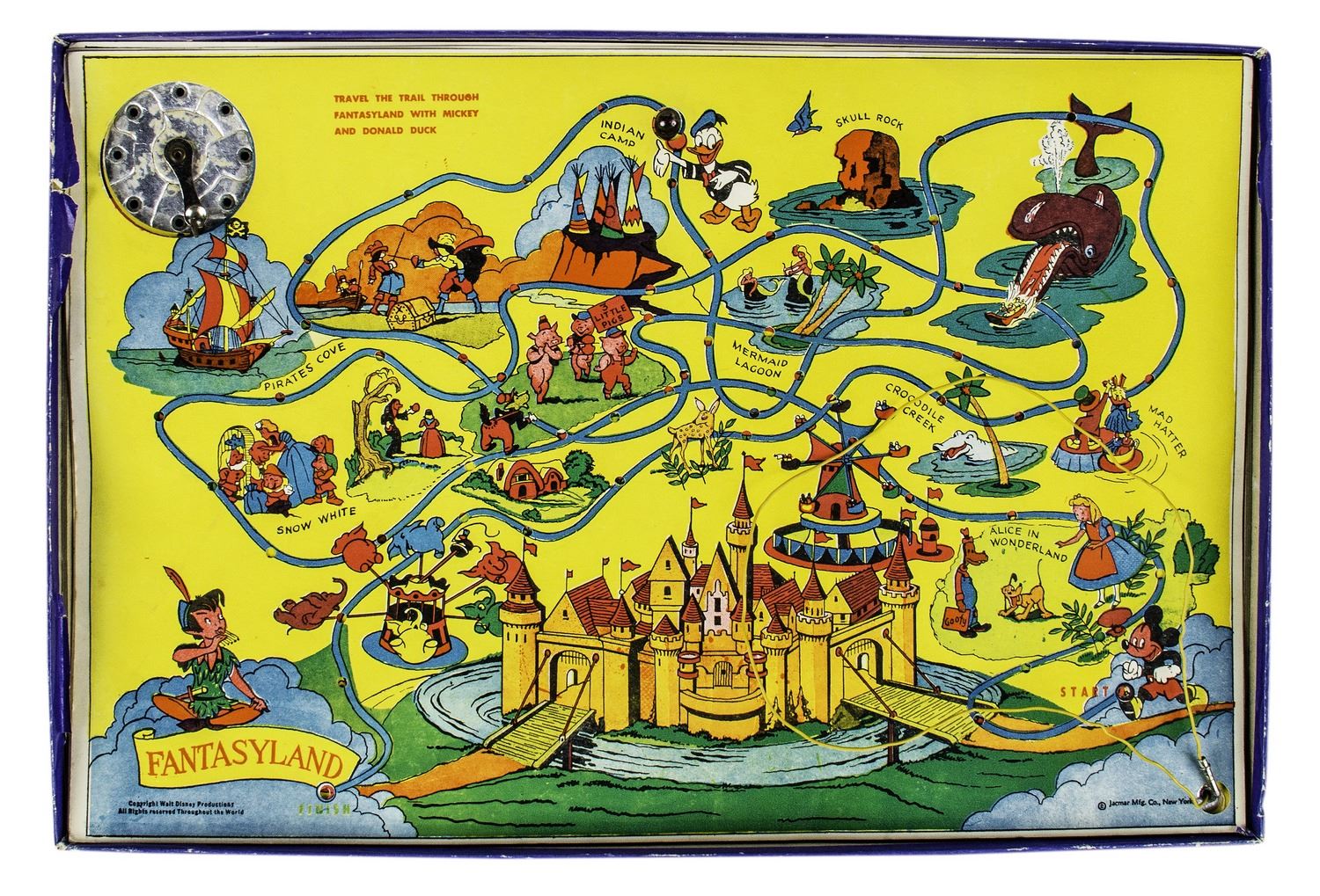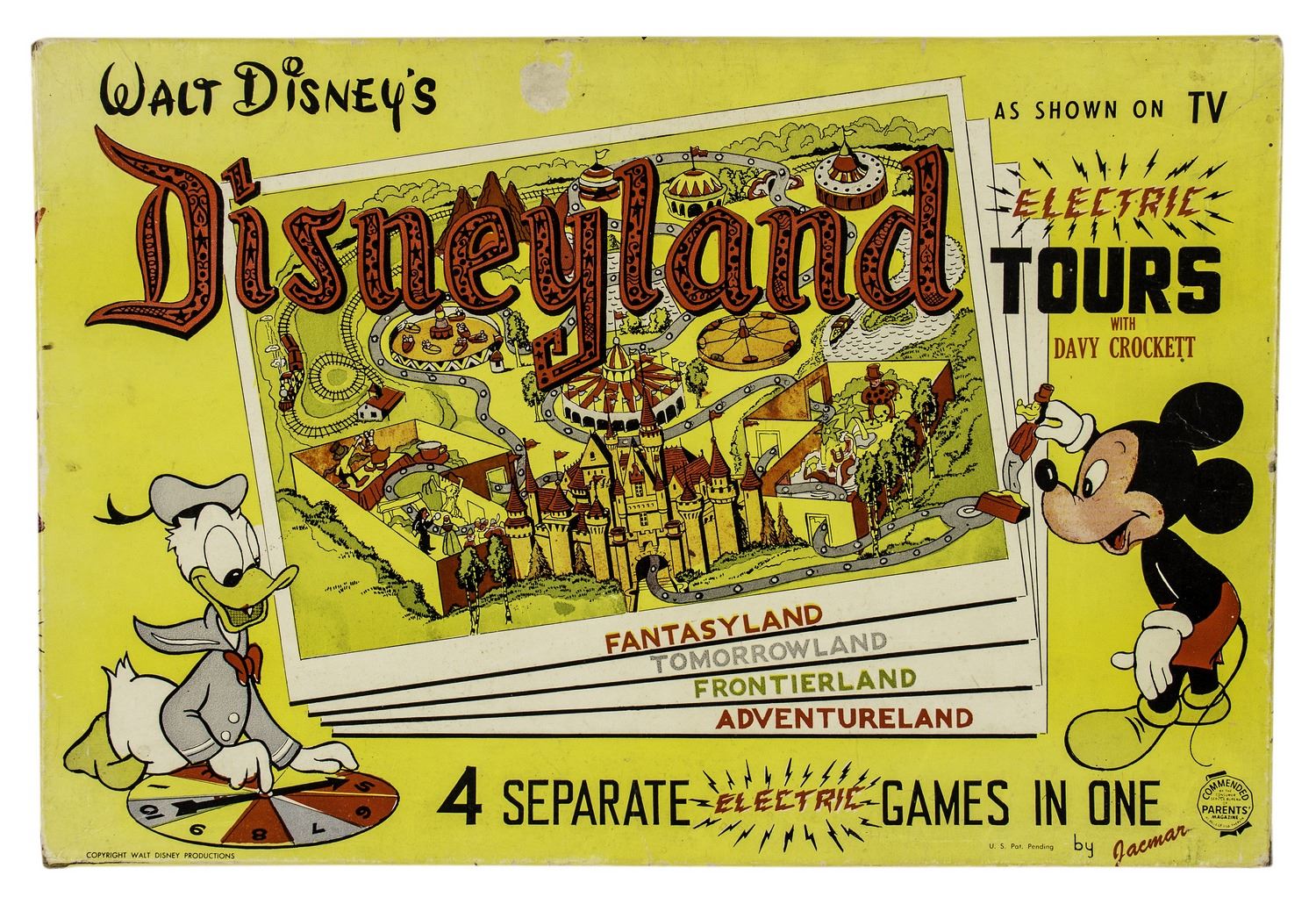 (Disneyland, c.1957) A vintage "Disneyland Electric Tours" game by Jacmar. The game includes the four boards themed after the different lands of the park, an attached spinner, and the game box. The instructions to play are printed on the underside of the lid. The box measures 12.5"x18.5" and 2" thick, and the game is in overall good condition with some minor wear from use. The game appears to be missing some components, and has not been tested for electrical functionality.