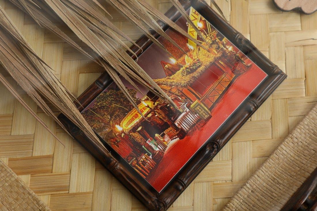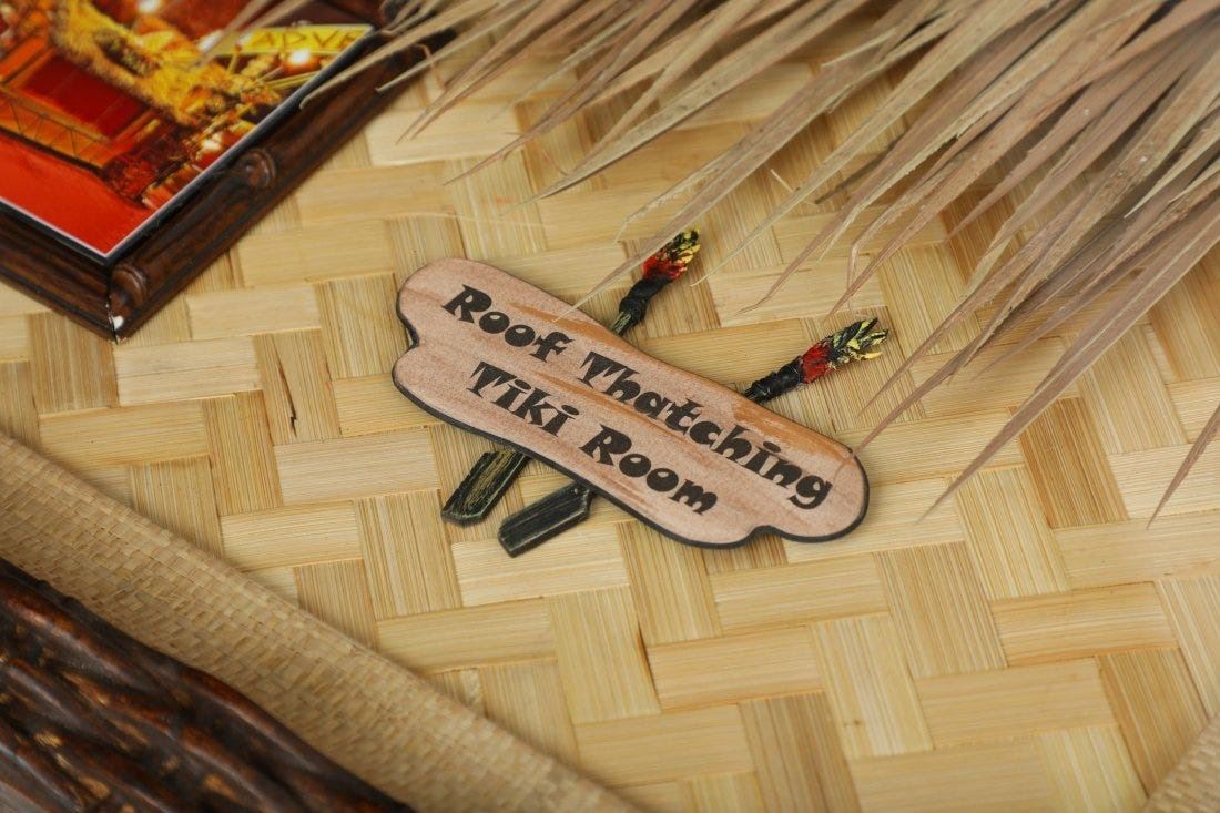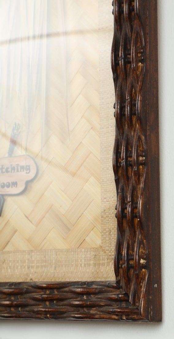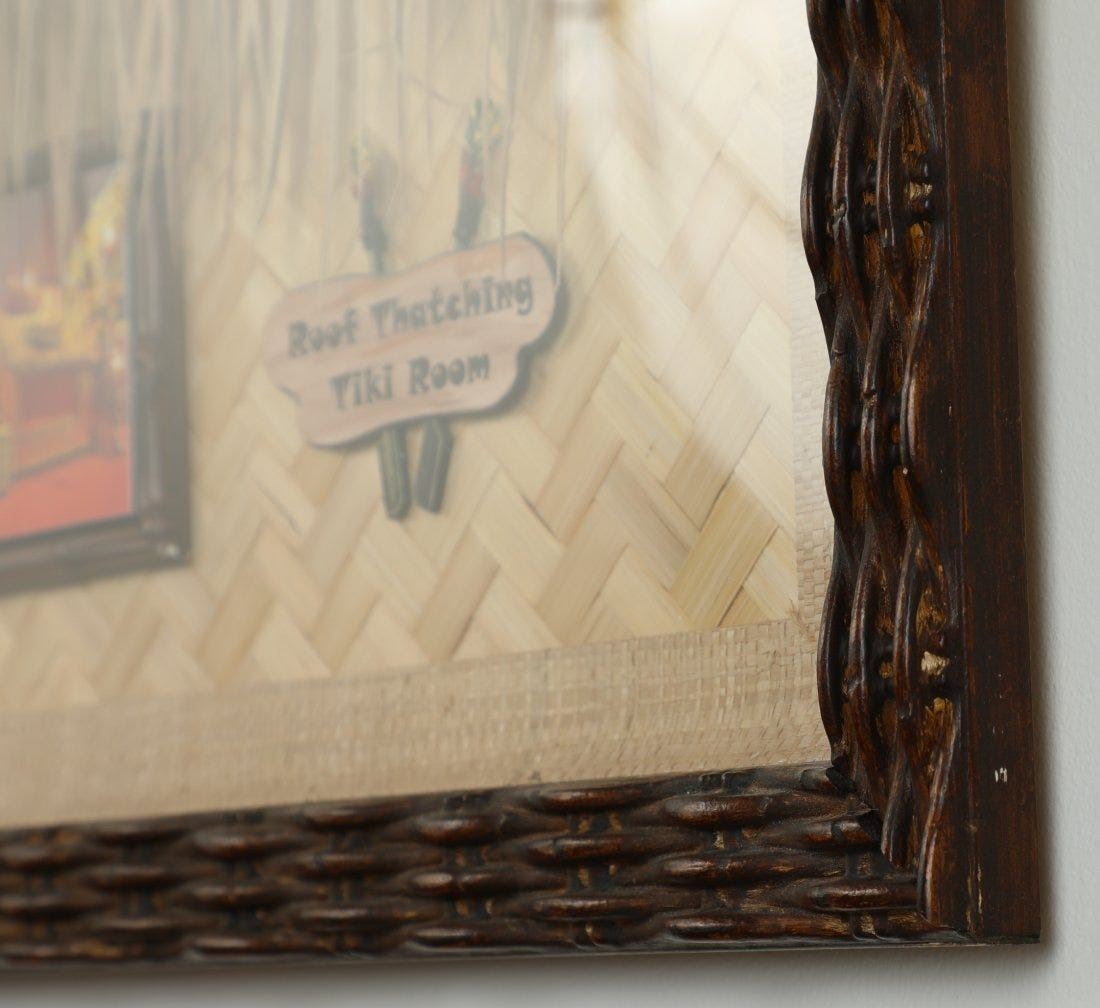 (Disneyland, Enchanted Tiki Room, c.1960's-1980's). Walt Disney's "Enchanted Tiki Room" first opened on June 23, 1963 and was the first attraction to feature Audio-Animatronics. A technology developed under Walt Disney's early team of Imagineers at WED Enterprises. Offered here is a park used roof thatching prop from Disneyland's Enchanted Tiki Room. The roof thatching is in good condition and has been expertly framed for display in a custom frame styled to the attraction itself. A photograph of the Enchanted Tiki Room and where this type of roof thatching could be seen by guests is also part of the frame.