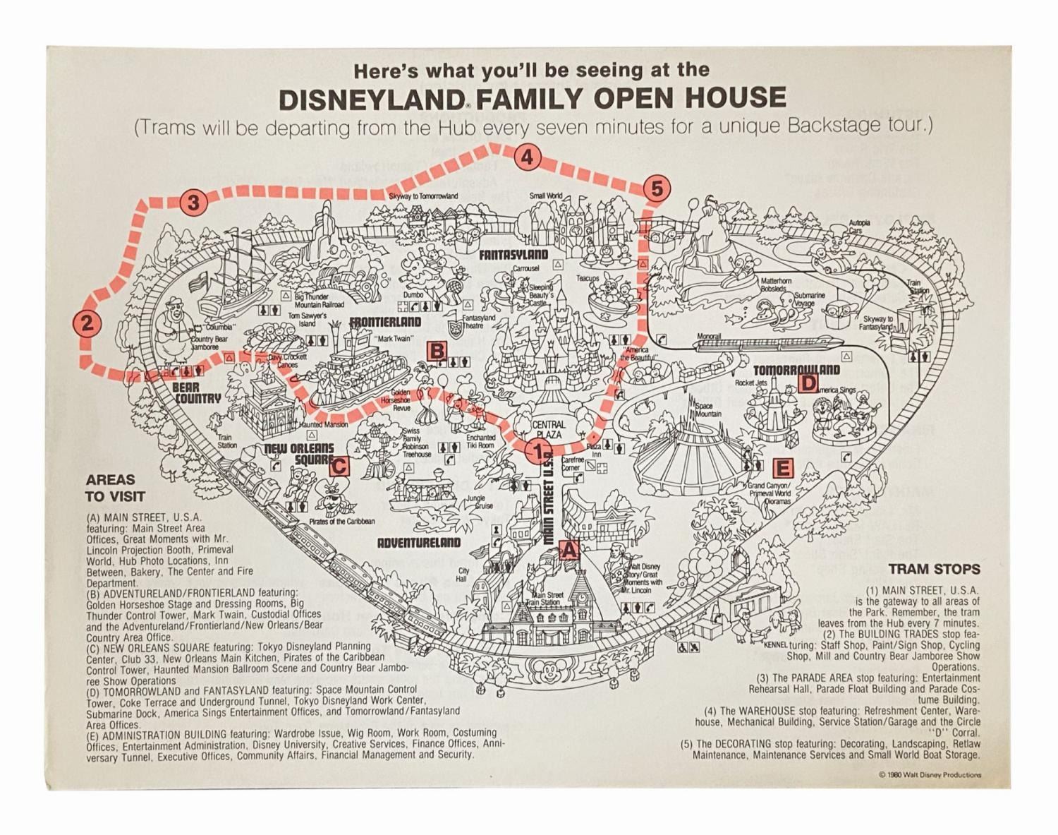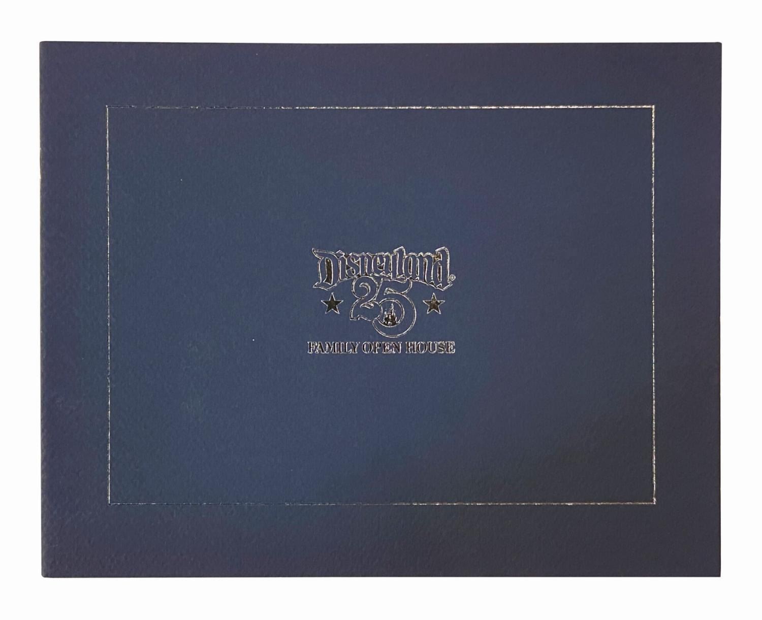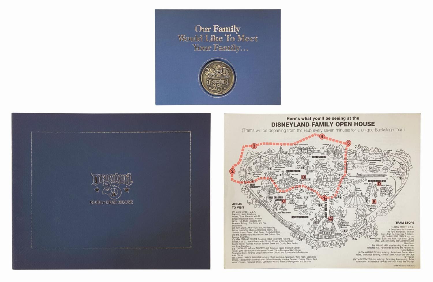 (Disneyland, 1980) A collection of items related to the Disneyland Family Open House event celebrating the park's 25th anniversary. This event was meant to offer family members a "backstage glimpse of the 'magic' behind the magic," and provided both a backstage tour and dinner for guests. Included in this collection is an invitation with a commemorative coin and reservation card, a map of the tour, and a booklet with photographs and descriptions of various Disneyland departments. Ranging from the 4"x5.25" reservation card to the 8.5"x11" booklet and map, the items are in very good condition with minor wear.