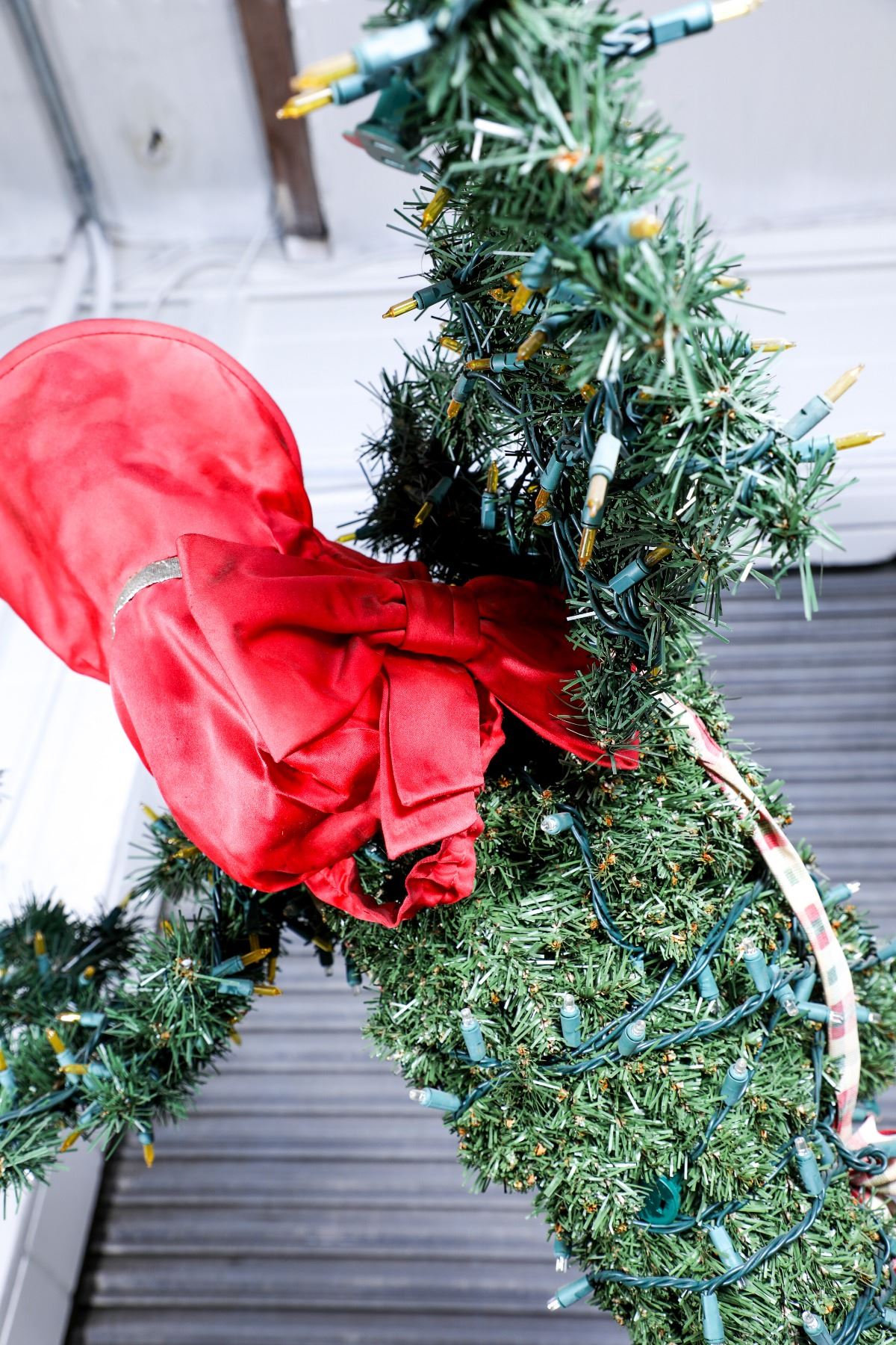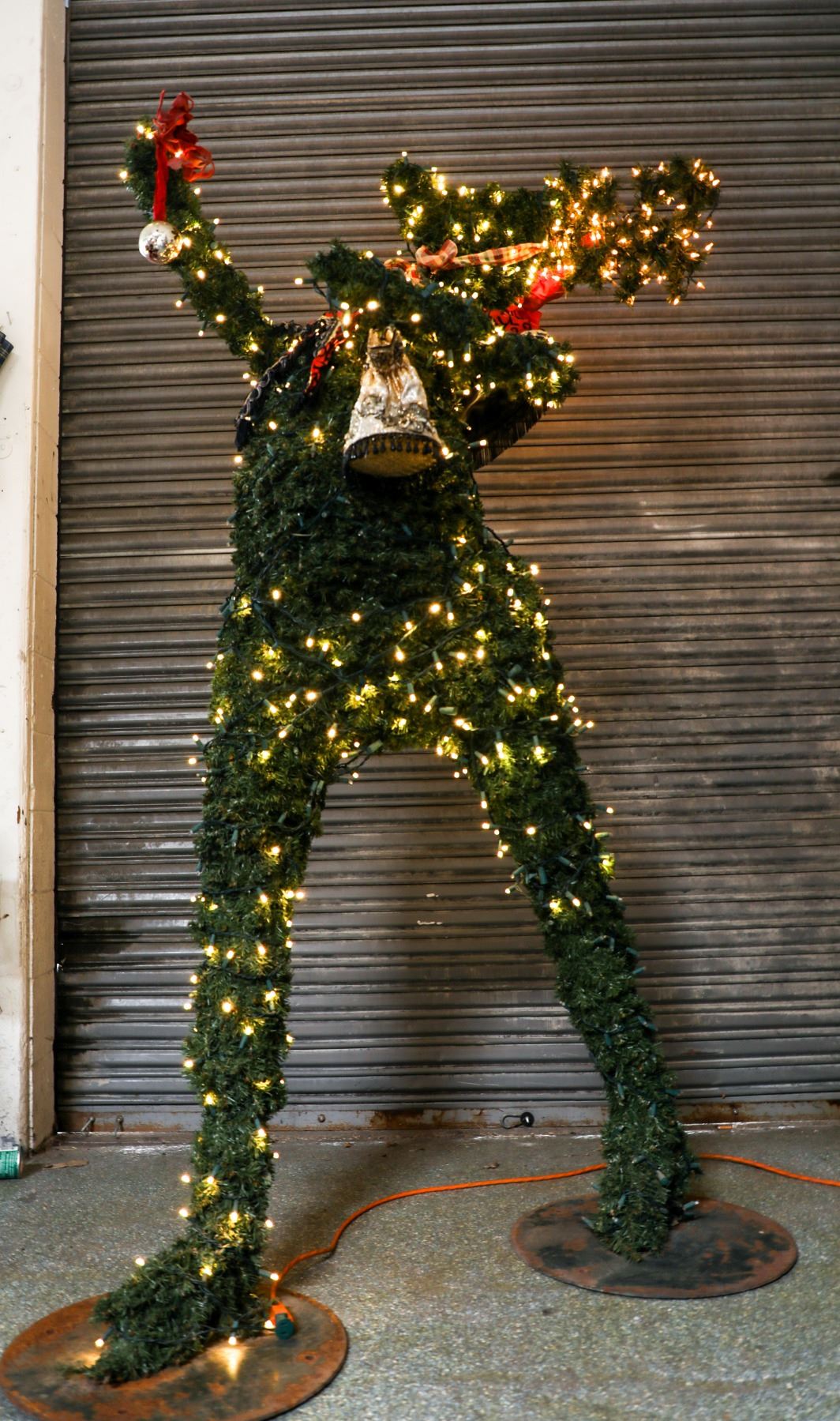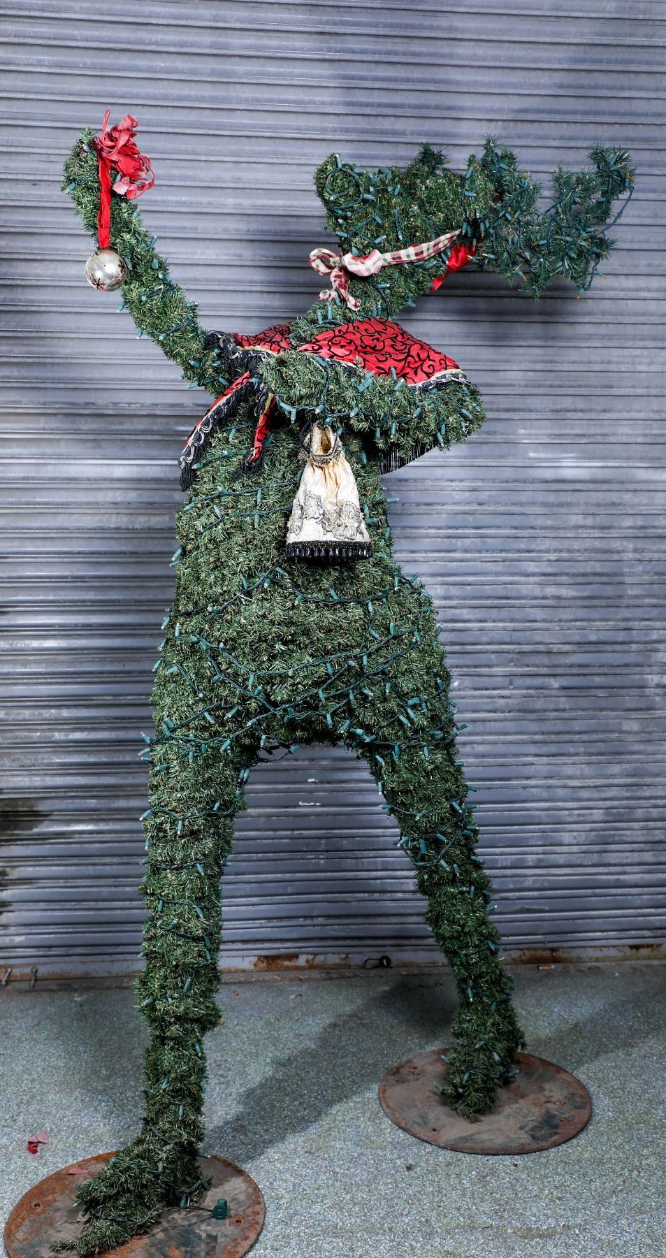 (Disneyland, Frontierland, c. 2000's-10's). An exquisite park used topiary prop from Frontierland. The animal topiary figures are beautifully displayed in Frontierland during the Christmas/Holidays Celebrations. Offered here is such a rare figure that has festive wear and lights for use during the holidays. This is a Deer that is that in a walking pose. Measures about 9 ft and weighs about 100 lbs. Stands on two metal plates. The figure also includes Cast Member/Stage used garments. Some of which have the Disneyland Property Tag. The figure is in good condition with normal wear from age and park use. Item comes with a Grand Circle Tour Auctions COA.