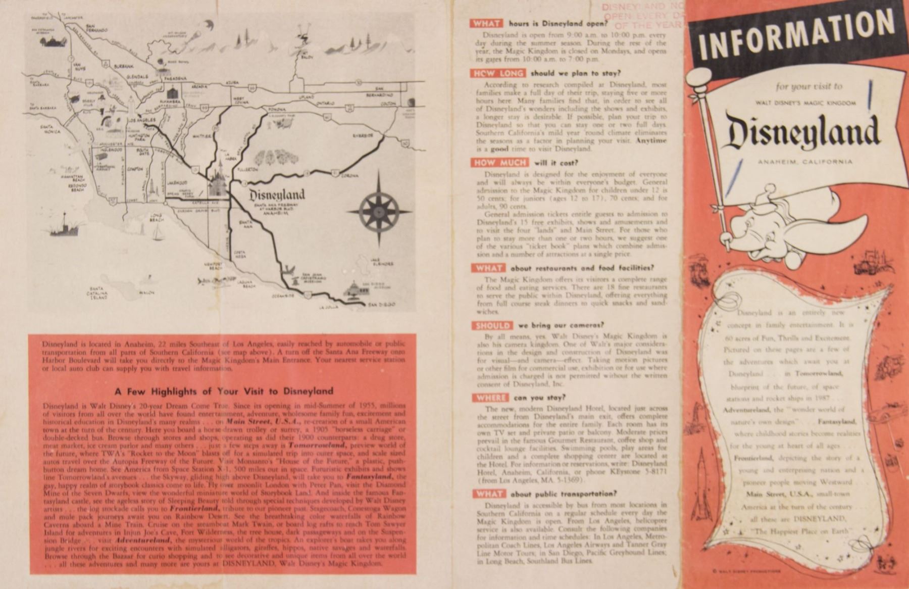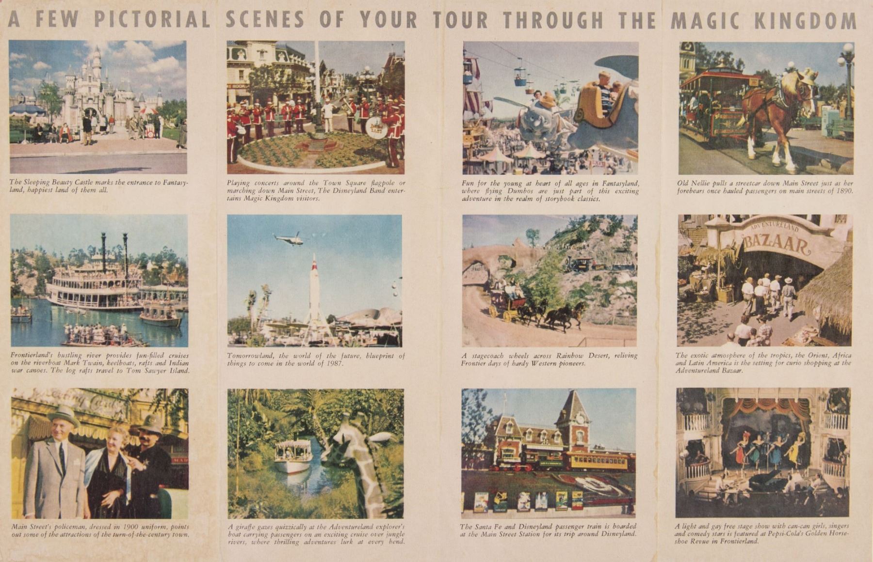 (Disneyland, c.1958) An early gate flyer from Disneyland with pictorial scenes of the park's attractions. This flyer measures 10.5"x4" folded and is in good condition with a small tear on the top-edge of the back and two ink marks on the front.