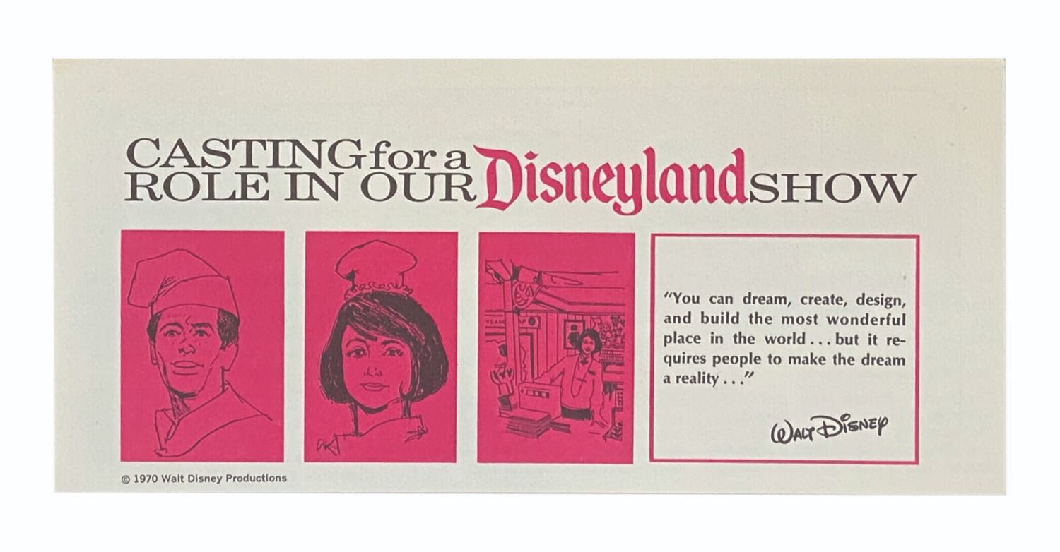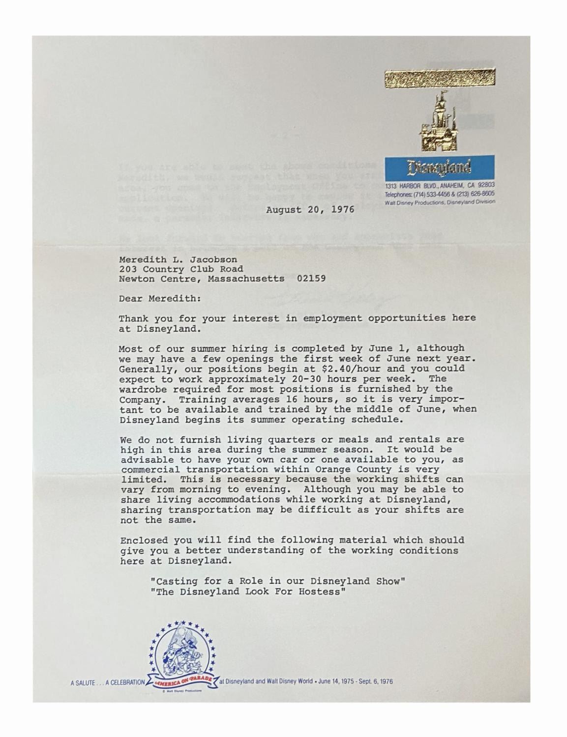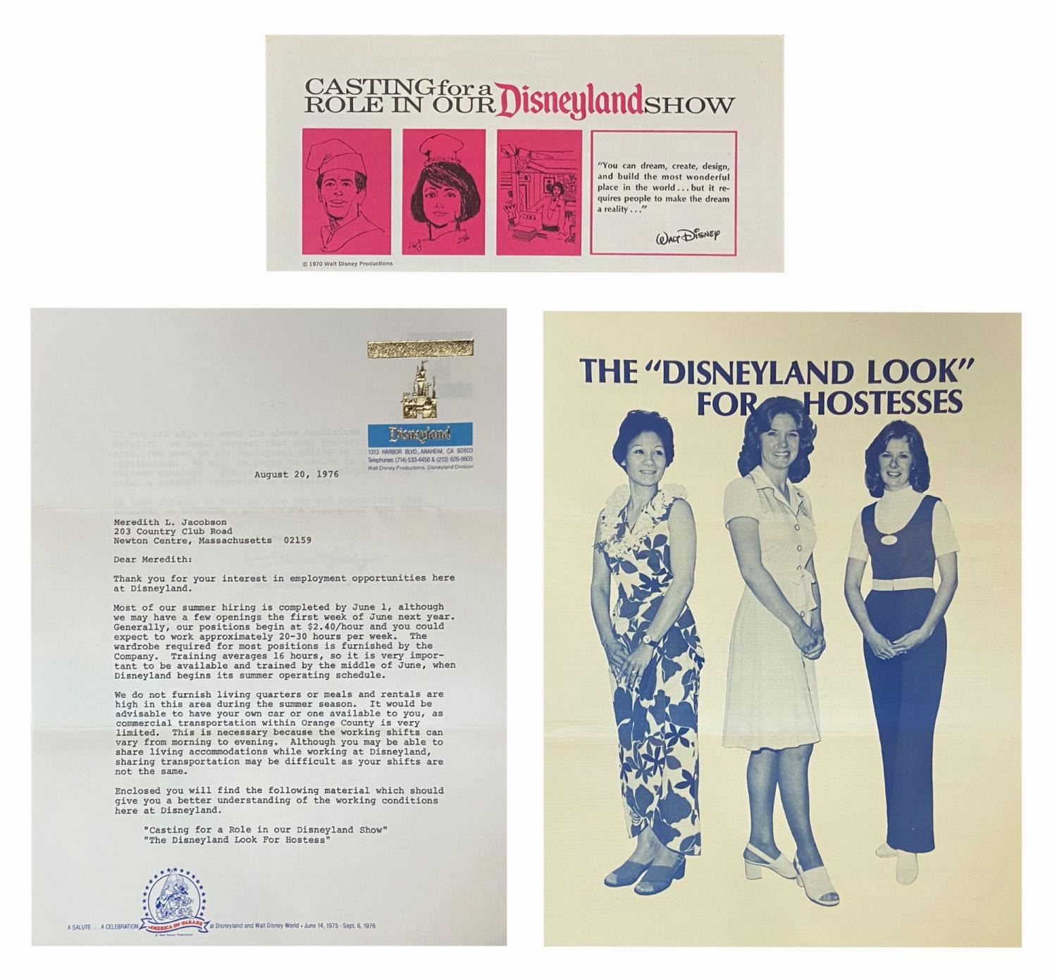 (Disneyland, 1976) A pair of informational pamphlets and a letter sent to a potential Disneyland cast member. The letter is in response to an inquiry by someone hoping to be hired by Disneyland in the summer of 1977, and discusses the basics of pay, hours, and the services which are and are not covered by Disney. Also included are a pamphlet for "Casting for a Role in Our Disneyland Show" and "The 'Disneyland Look' for Hostesses," to give this potential cast member a better idea of what to expect in the hiring process. Ranging from 4"x8.5" to 11"x8.5", the collection is in very good condition with minor edge-wear, and some wear to the original envelope from mailing.