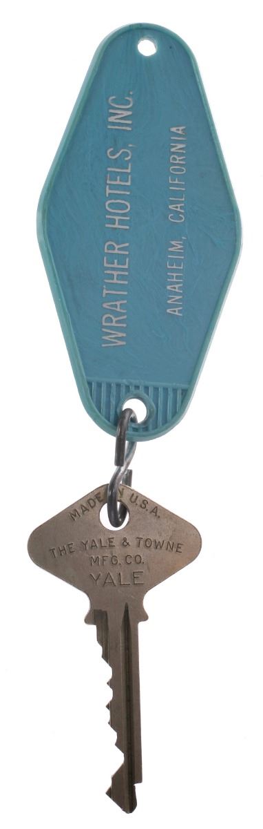 (Disneyland, 1960s) Original key to a room in the Disneyland Hotel. Key is engraved "1069" and was manufactured by Yale & Towne. The fob reads "Wrather Hotels, Inc". Key measures 2.5"x1.5". In good condition with minimal wear.