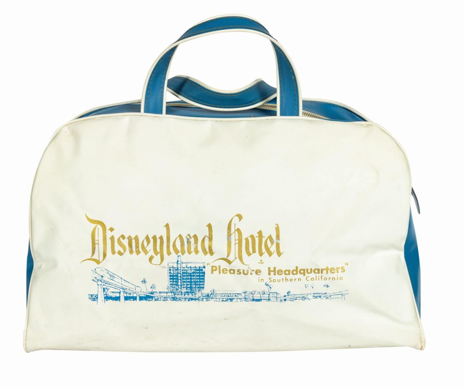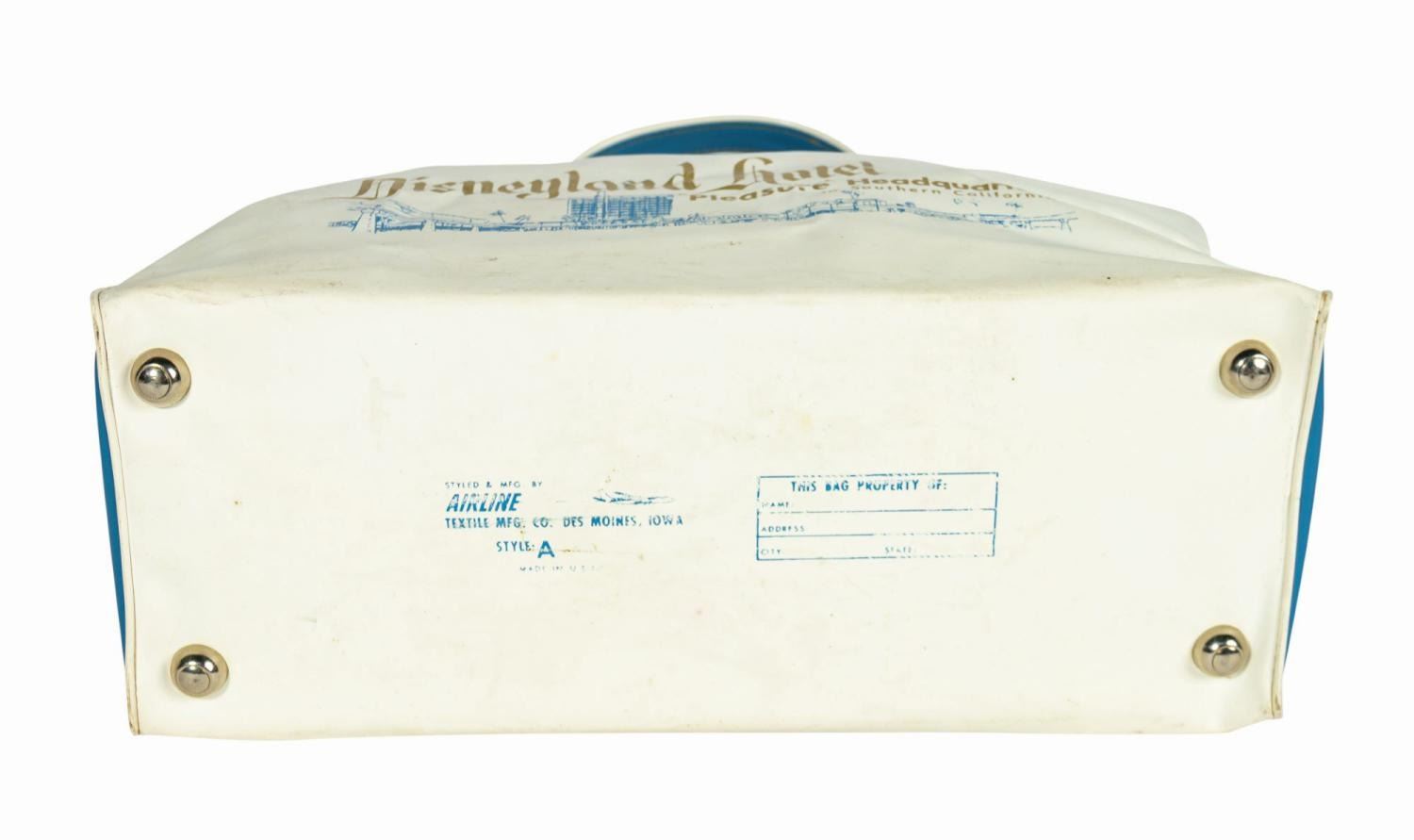 (Disneyland Hotel, 1960s) A promotional travel bag by Airline Textile Mfg. Co. for the Disneyland Hotel. The vinyl bag reads "Disneyland Hotel 'Pleasure Headquarters' in Southern California." Measuring 6"x15" and 12" tall with the handles included, the bag is in good condition with moderate surface wear, including spots of scuffing, discoloration, and general wear to the printed imagery. There are some instances of spotting and staining throughout, as well as several small puncture marks to the surface.