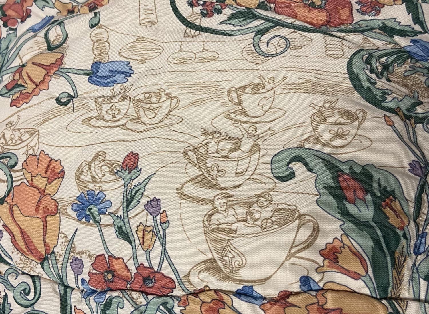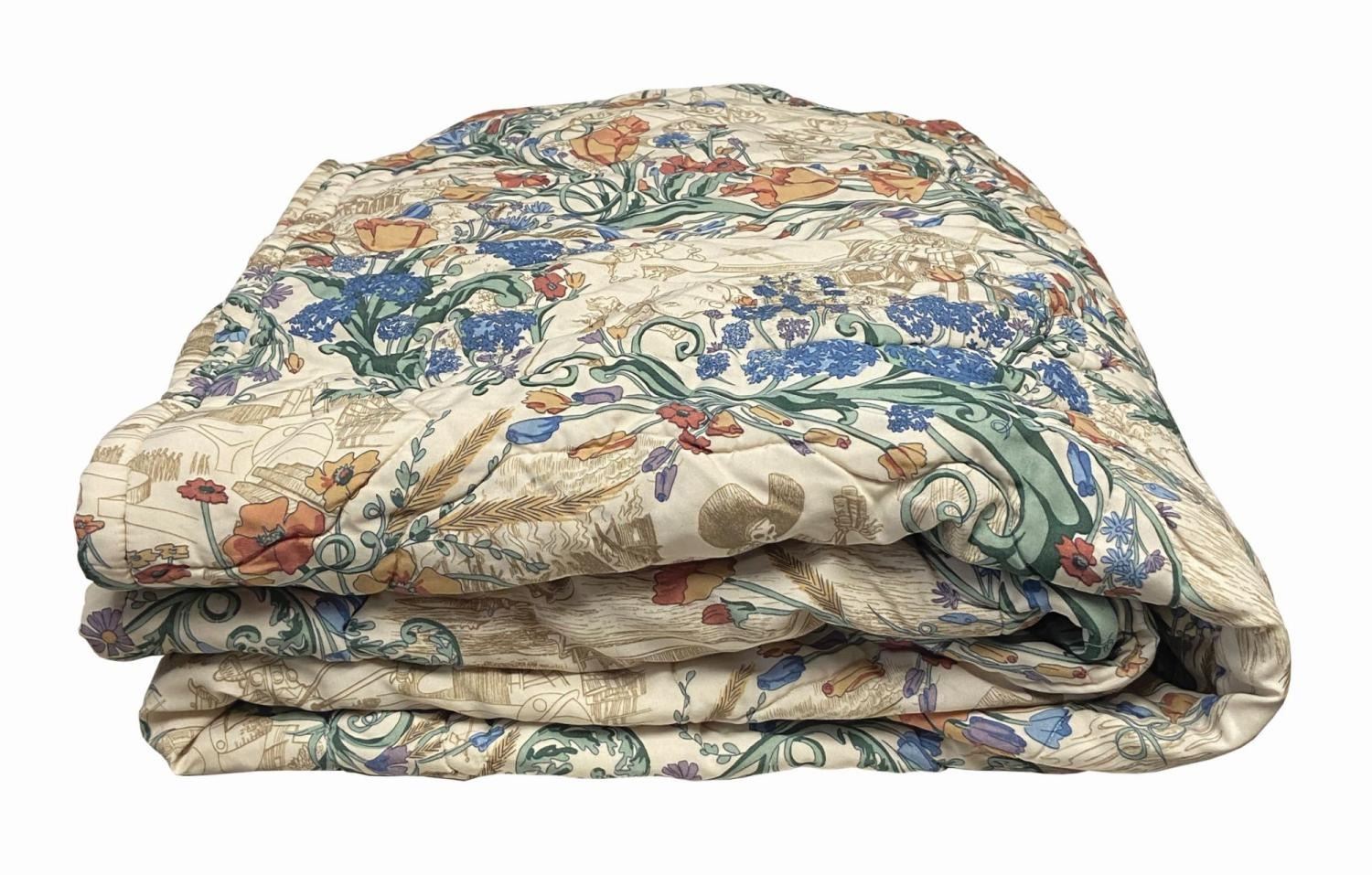 (Disneyland Hotel, c.2000s) A queen size bedspread used at the Disneyland Hotel. This bedspread has subtle park attraction imagery with floral accents throughout and is designed to also fit over the pillows to create a clean and well-presented look for the bed. Marked as a Queen size, the bedspread is in very good used condition with a spot of ink staining near the lower left corner, and minor surface wear to the underside.