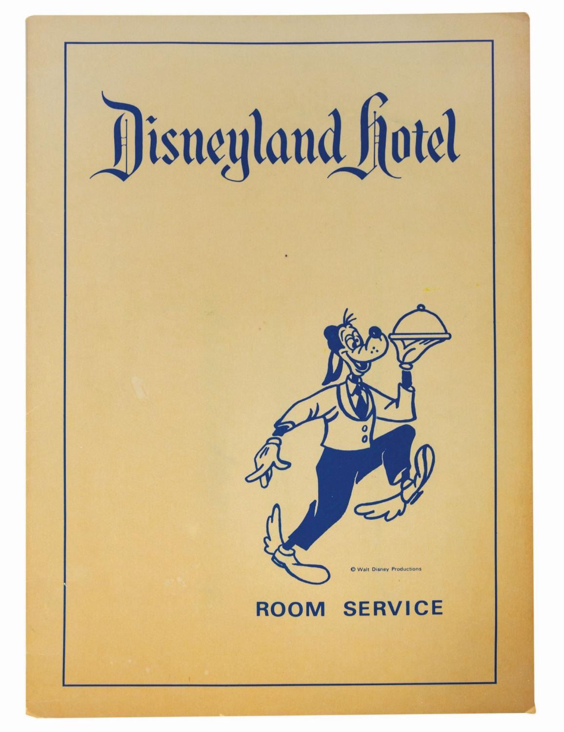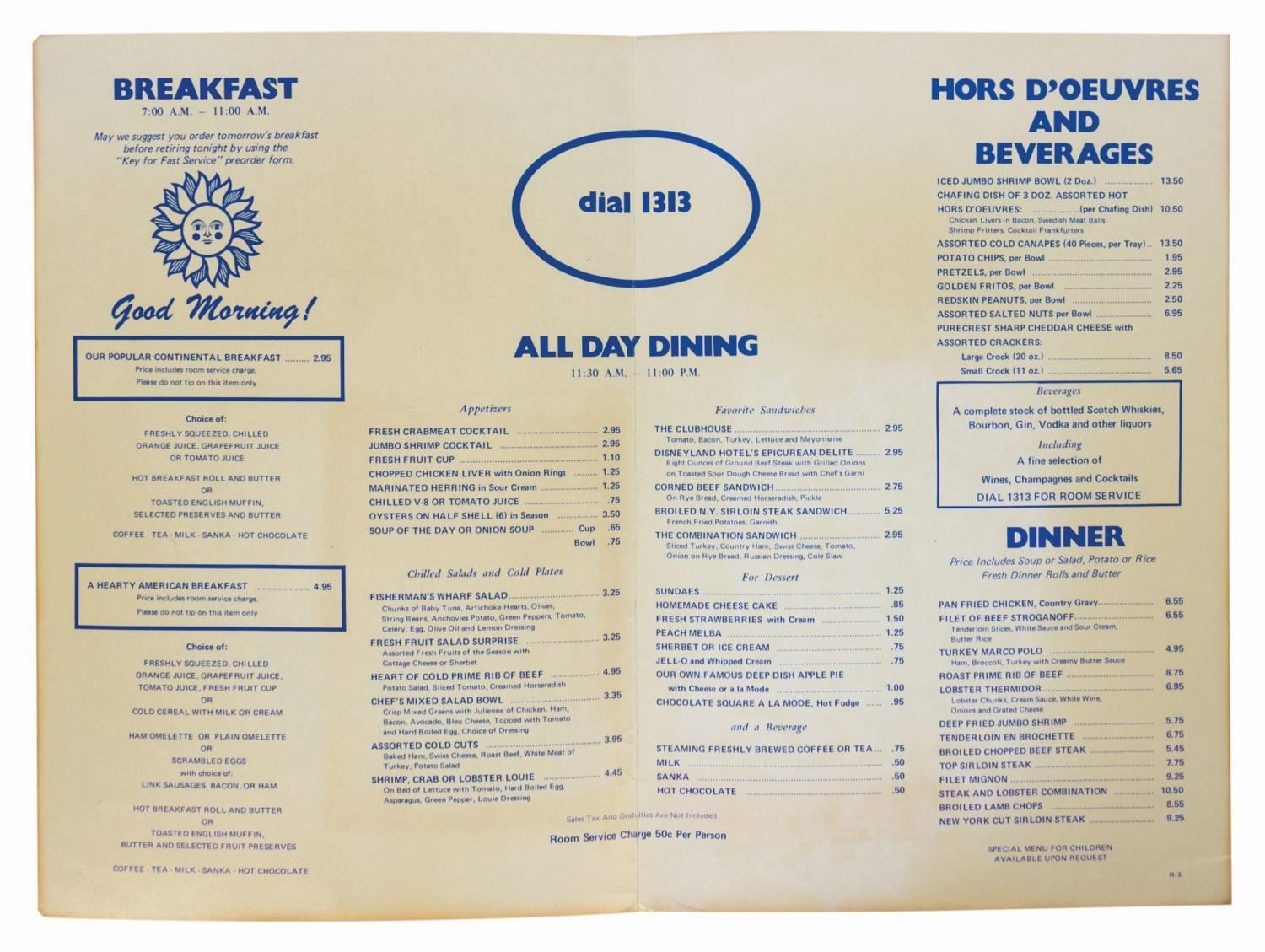 (Disneyland Hotel, c.1970s) A room service menu from the Disneyland Hotel. Featuring options such as breakfast, all day dining, hors d'oeuvres, beverages, and dinner, the menu offers a variety of dishes, notably including a steak and lobster combination for only $10.50. The reverse lists the hotel's restaurants, with old favorites such as El Vaquero, The Oak Room, The Shipyard Inn, The Chef's Kitchen, and more. Measuring 12.25"x8.25", the menu is in good condition with some browning throughout from age, as well as some edge and handling wear.