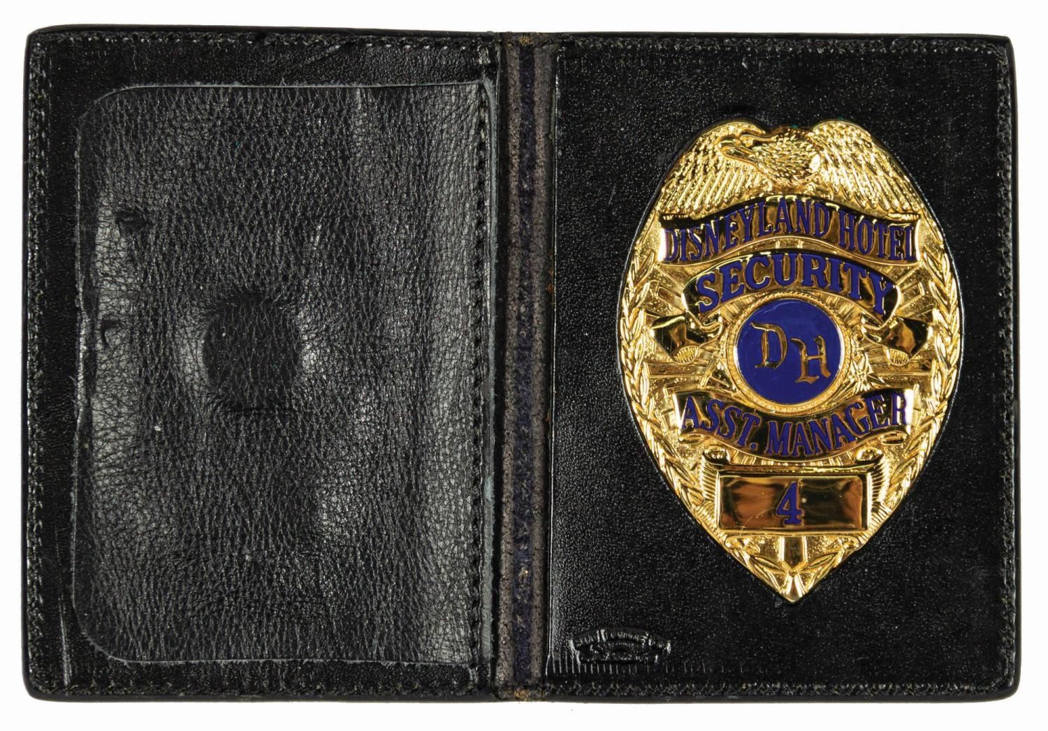 (Disneyland Hotel, c.1980s) A rare Disneyland Hotel Security Assistant Manager #4 badge in a badge wallet. The shield-shaped gold-tone cast metal badge features an eagle figure at the top, four banners reading "Disneyland Hotel Security Asst. Manager 4" in blue enamel, and a central DH monogram logo in blue enamel. The Wrather Corporation owned and operated the Disneyland Hotel until 1988, when they were acquired by Disney. The badge measures 3.25"x2.25" and is adhered in a 4.5"x3.25" bifold black leather wallet with an internal windowed ID card pocket and protective leather flap. Both are in very good condition exhibiting minor wear. The wallet exhibits some surface impressions.