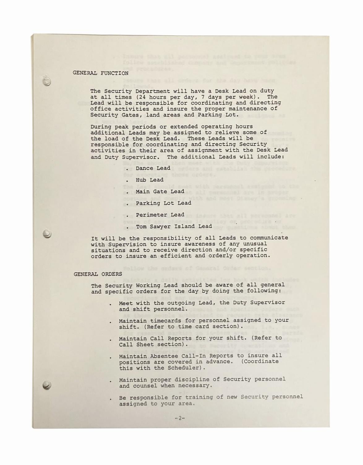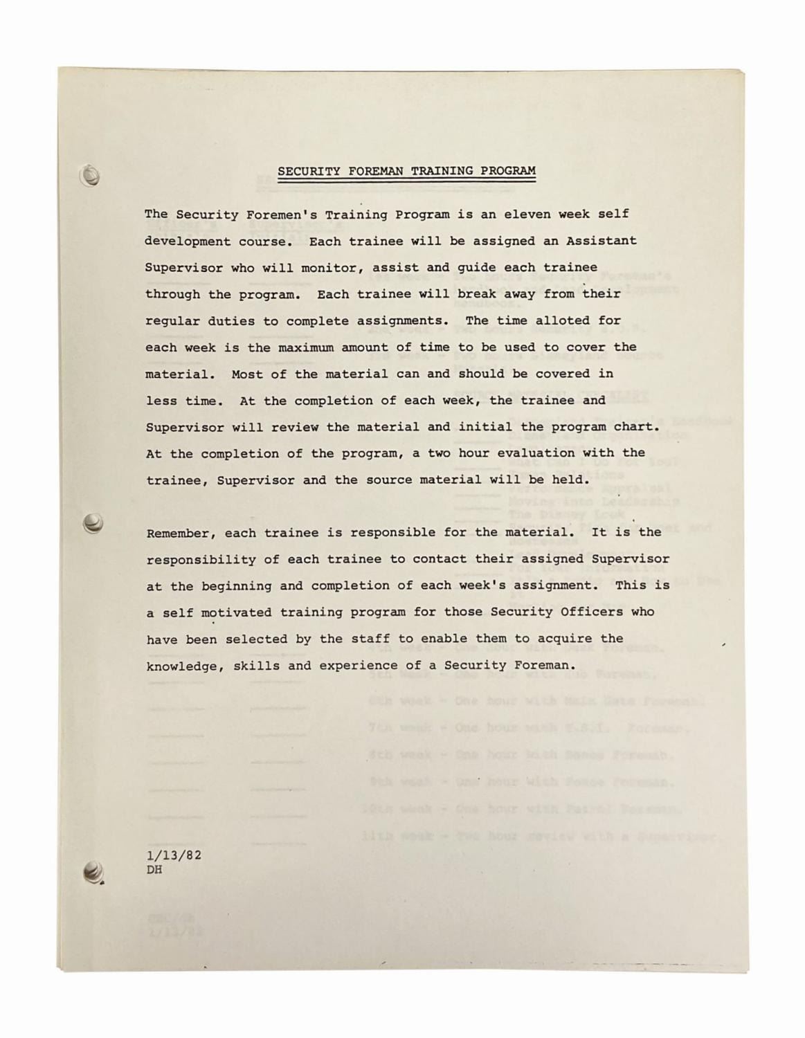 (Disneyland Hotel, 1982) A Security Foreman's Training Program manual from the Disneyland Hotel. Consisting of (30) 3-hole punched copy pages, the manual features Mickey Mouse dressed as a security guard on the cover page and contains the curriculum for an 11-week training course. Created when the hotel was still under the proprietorship of the Wrather Corporation, these documents provide an interesting look at the rigorous professional standards maintained by Disney and required of all their partner companies. Measuring 11"x8.5", the manual is in very good condition with some edge wear and spot loss, faint even browning, and creasing along the left edge from previous binding.