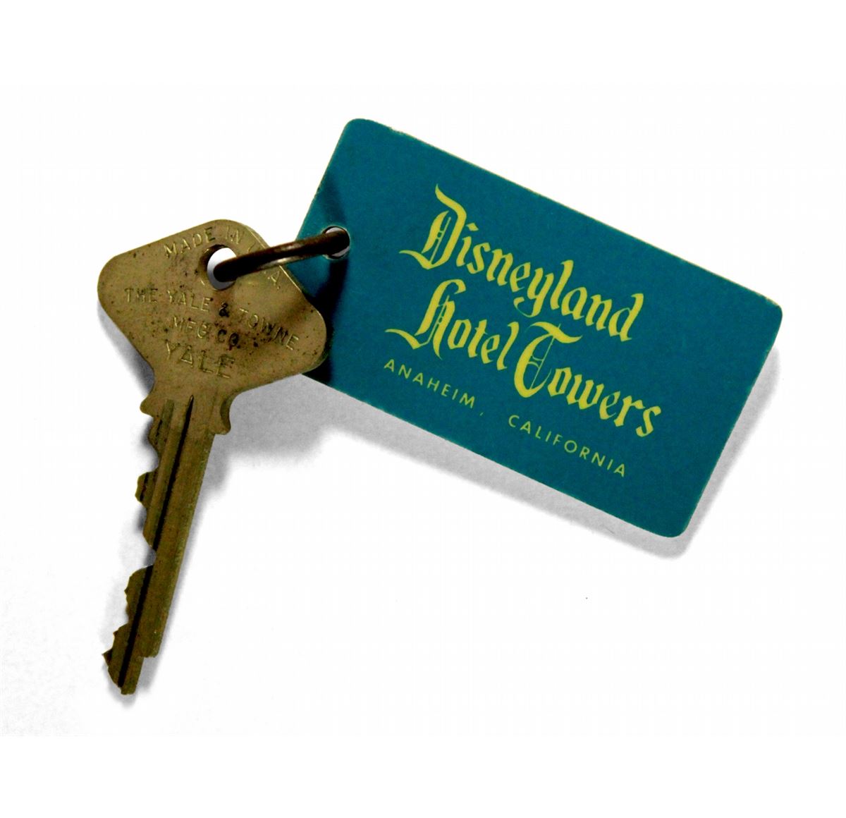 (Disneyland, 1962) This handsome room key was the second version of the Disneyland Hotel standard issue. “The Towers”” indicates the 1961-2 addition of the first high rise tower to the hotel. Note the Yale & Towne Mfg Co stamp, at that point, still a high-profile sponsor/leasee at Disneyland with their own themed shop on Main Street. Key measures 1.5 x 2.25 in. Fob measures 1.25 x 2.5 in. In very good condition.