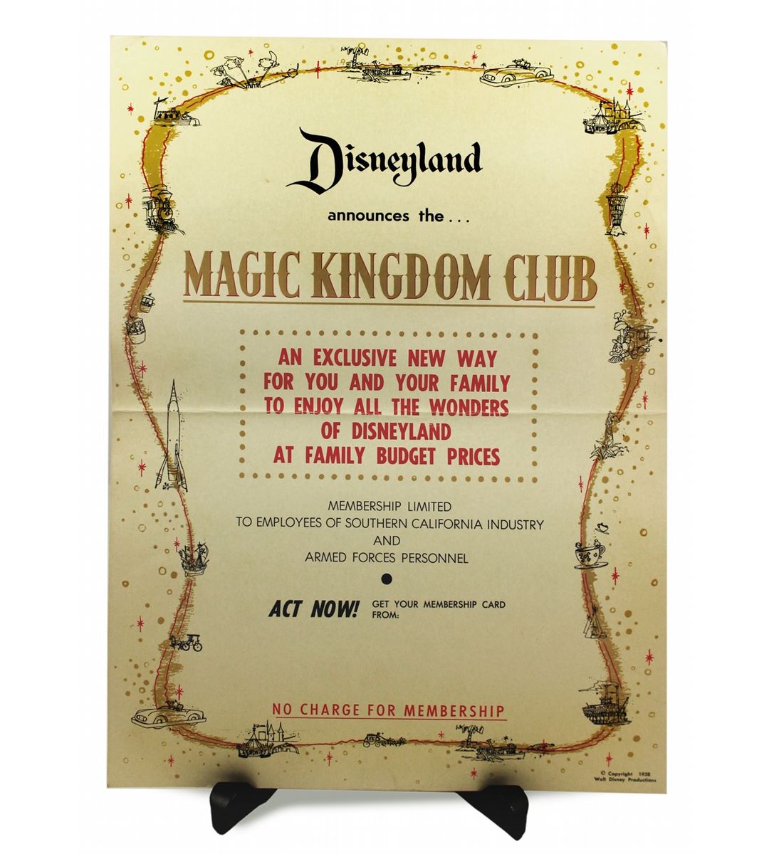 This poster would hang in the ticket booth window at Guest Relations. Rare. Measures 14"x10.5". Fine condition, with light edge wear. A few small tears in the edges of the poster, and a crease from where the poster had once been folded horizontally down the middle. Beautiful detailed boarder images around the poster highlight the different attractions of the park.