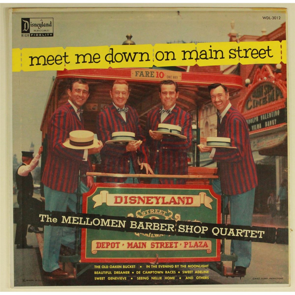 Meet Me Down On Main Street LP Record by the Mellowmen from 1957. The first Barber Shop Quartet on Main Street were the Mellowmen, led by Disney voice over star, Thurl Ravenscroft (pictured on the far right of the LP).