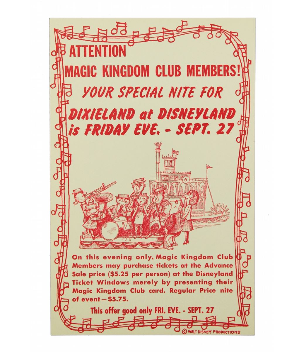 A nice handbill for Magic Kingdom Club members to buy exclusive preview tickets for the 1963 "Dixieland at Disneyland" event.