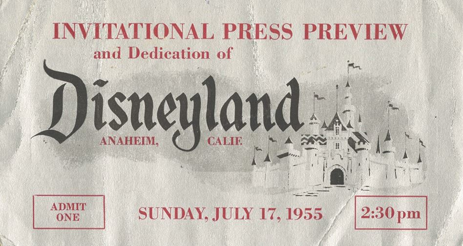 (Disneyland, 1955) A very rare silver opening day press preview ticket. Because Disneyland's opening day events were being broadcast on Live TV, guests and VIPs were requested to arrive at different times to accommodate the televised ceremonies. This particular pass features an entrance time of 2:30pm, and includes information on the back about ABC's live broadcast of the events. The ticket measures 3.5"x6.5" and is in good condition with some creasing and surface wear from use.