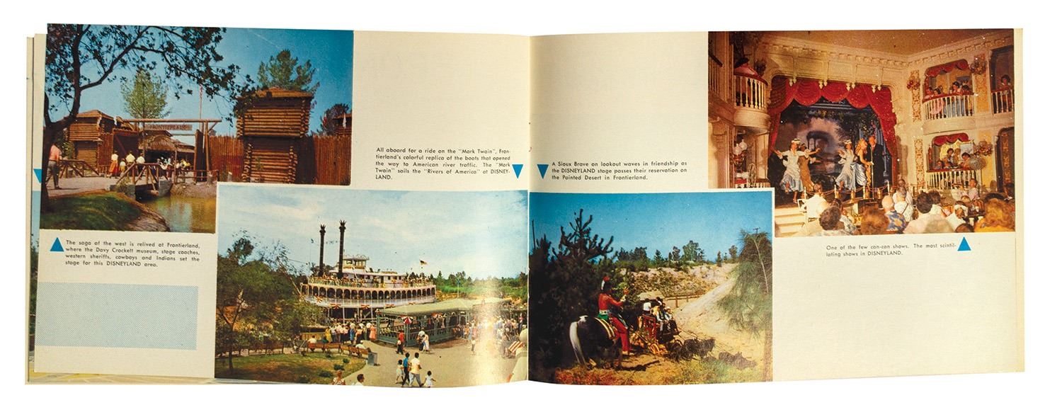 (Disneyland, 1955) A very rare souvenir picture guidebook from Disneyland's opening year. The book features great cover imagery of Walt Disney with an aerial map of the park. The 24-page book includes photos and information of the opening year attractions, including now extinct attractions such as the Rocket to the Moon, Clock of the World, Chicken of the Sea Pirate Ship, and Indian Village. Measuring 6"x8.75", the guidebook is in good condition with minor edge wear, a small puncture in the front cover, and creases that extend through the entire book.