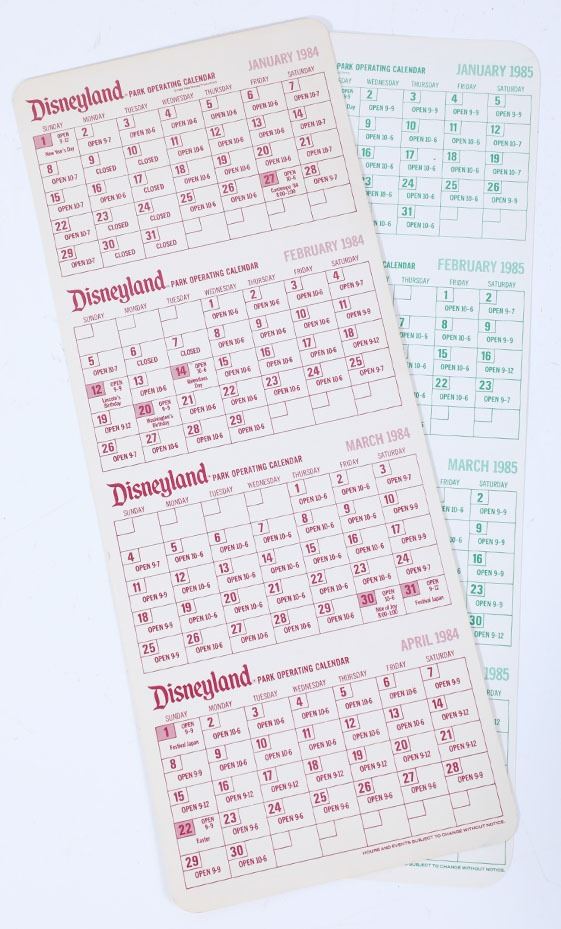 (Disneyland, c. 1984-85). A rare group of Disneyland park operating calendars used by cast members. The calendars are in good condition with normal wear from age and handling. Item comes with a Grand Circle Tour Auctions COA.