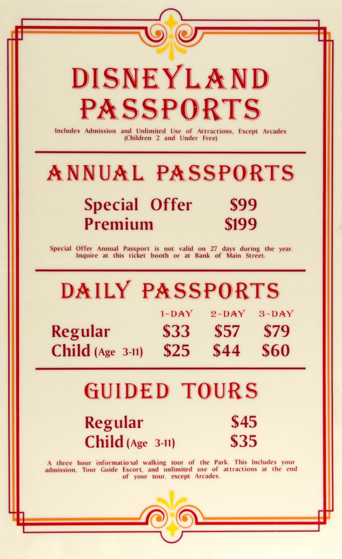 (Disneyland, c.2000) An original price sign for Disneyland Passports which would hang at the entrance to the park. Signs like these were seen by countless park guests and represent the very beginnings of most Disneyland trips: the ticket purchases. The sign is constructed of acrylic board and measures 36"x22.5". The condition is very good with some expected wear throughout from park use.