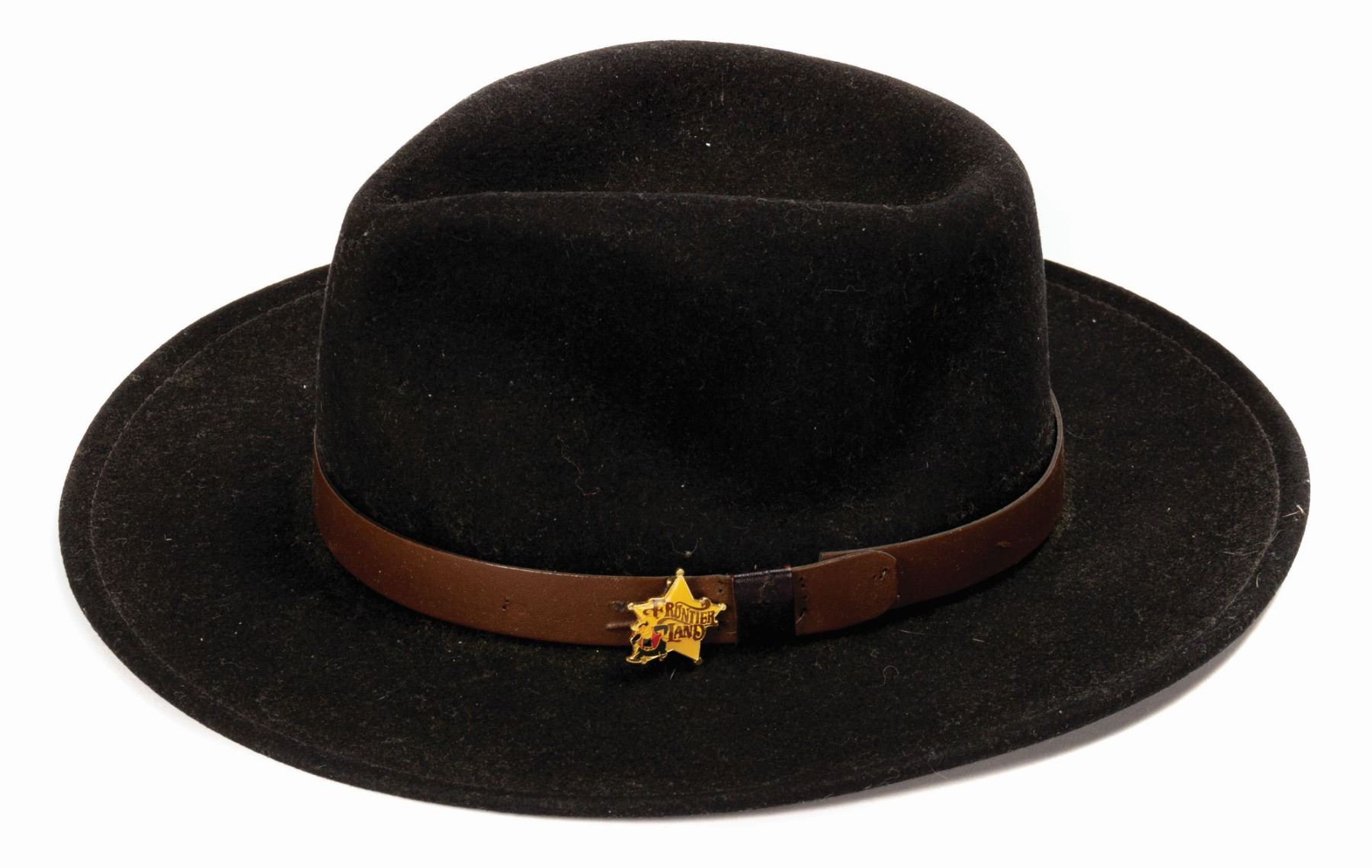 (Disneyland, c.1980s) A Western style fedora created by Pendleton Woolen Mills exclusively for Disneyland. The black wool felt hat features a brown leather hatband with affixed Disneyland 30th Anniversary Frontierland pin. The hat is not marked for size but measures 7.75"x6.75". It is in very good condition, exhibiting only general wear from age.