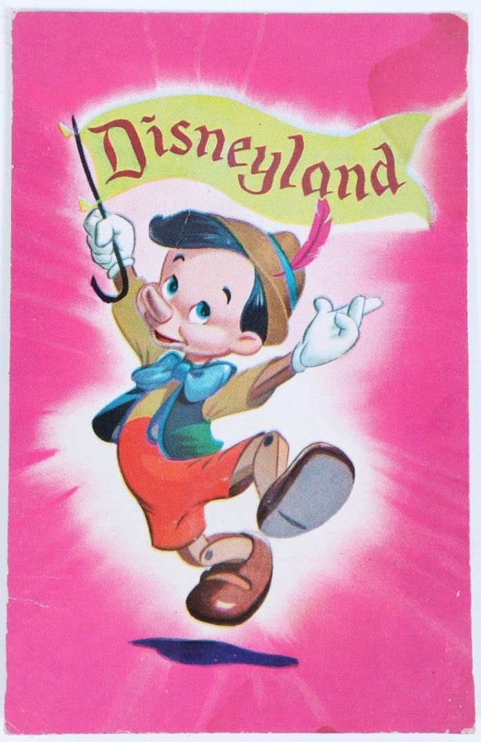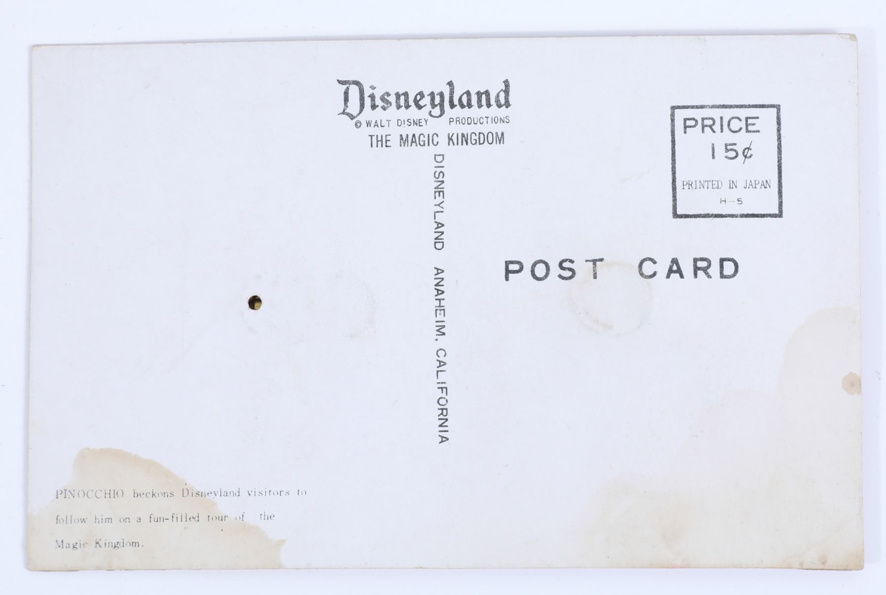 (Disneyland, Main Street U.S.A., c. 1960's). A rare, unused vintage Disneyland Pinocchio squeaker postcard. The postcard is in fair condition with some staining and edge wear. Item comes with a Grand Circle Tour Auctions COA.