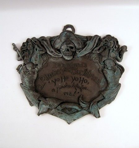 When Disneyland revamped their most popular ride "Pirates of the Caribbean" to add elements from their massively successful franchise of movies, some of the older signs were taken down. This is a reproduction of one of those iconic signs that hung for years in the original ride in the Anaheim California theme park. It is bordered with mermaid-sirens and the iconic pirate hatted eye-patched pirate in the middle, engraved with "Disneyland's Pirates of the Caribbean" under it, and the opening of their classic theme song (sing with me!) "Yo Ho Yo Ho a pirates life for me!". Shows signs of age. (Approx. 18" x 16").