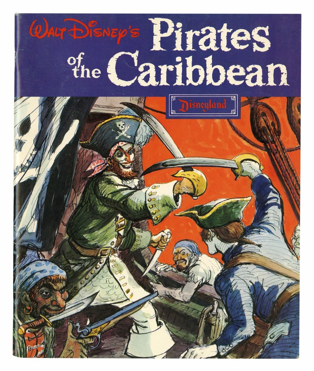(Disneyland, 1968) Rare pictorial guide for Disneyland's "Pirates of the Caribbean" attraction. Features early color photos, behind the scenes photos, Marc Davis' early concepts for the ride, and more. Measures 9"x10.75". 40 pages. In good condition.