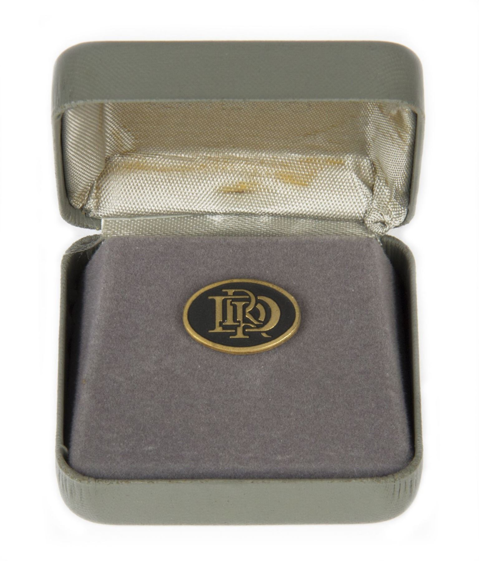 (Disneyland, c.1980s) A cast member pin for the "Disneyland Railroad". The pin features the Disneyland Railroad's "DRR" logo and has a manufacturer backstamp for Sundance Portland. Measuring 0.5"x0.75", the pin is in very good condition and comes in its original box.
