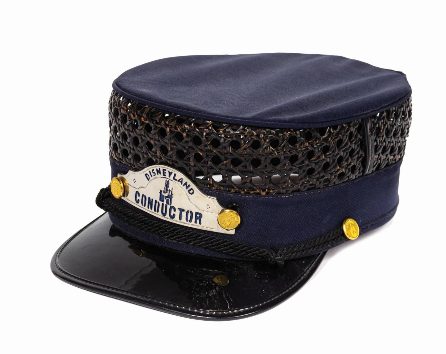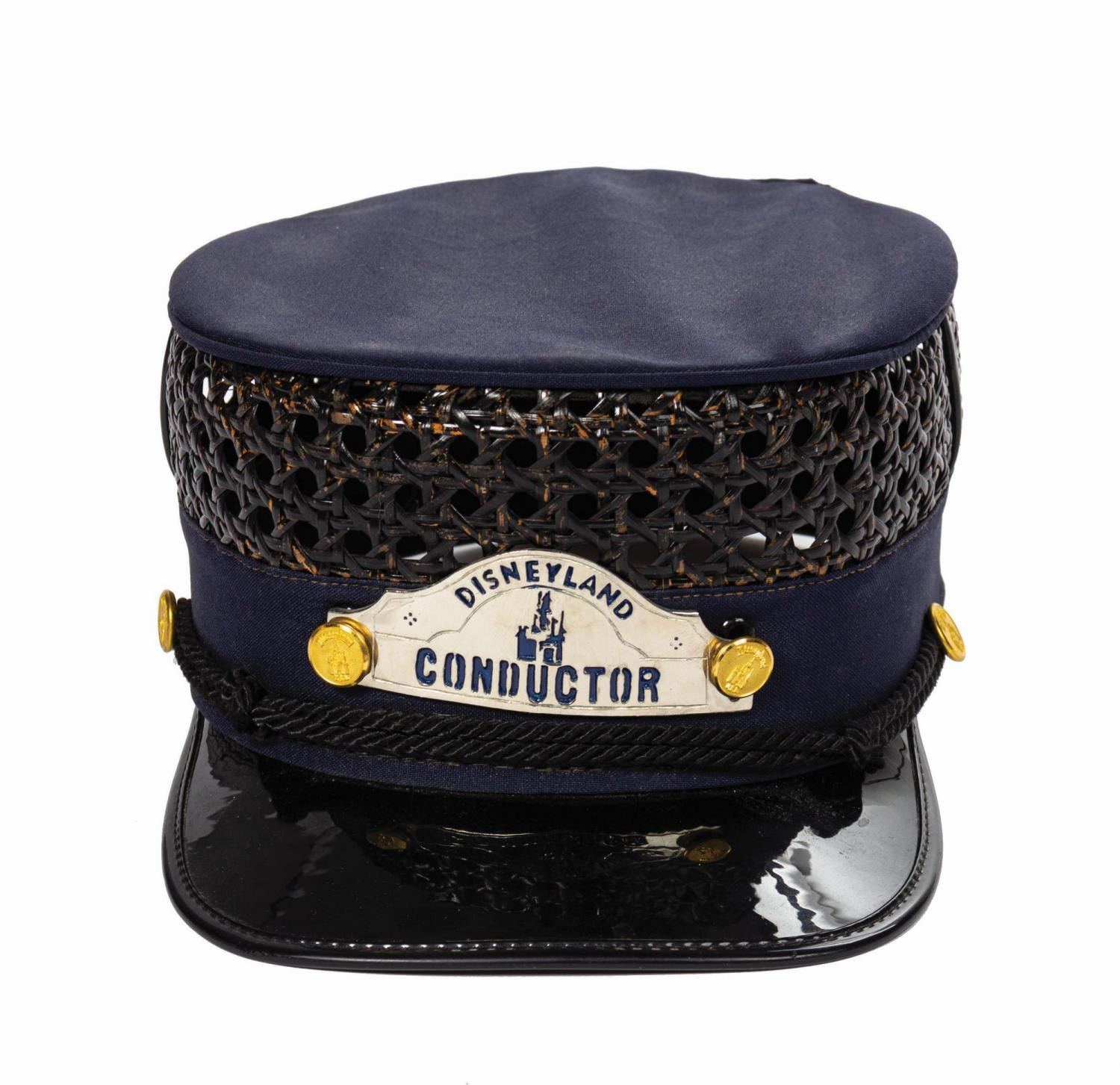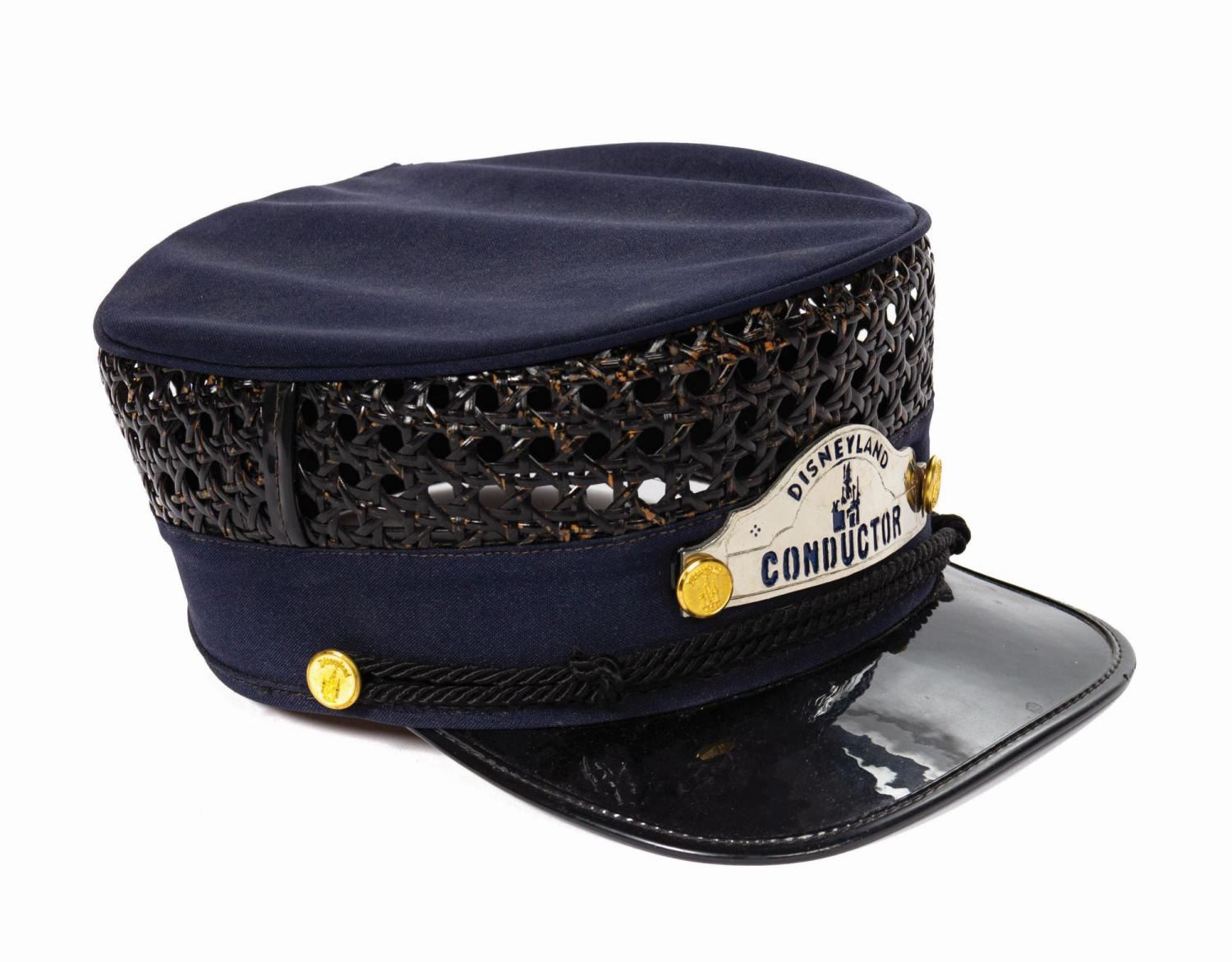 (Disneyland, c.1990s) A park-worn conductor hat from the Disneyland Railroad. The navy-blue hat features a woven straw vent below the crown, a black patent leather lined bill, a rare Disneyland Conductor silver metal hat badge with blue enamel fill, gold tone Sleeping Beauty Castle fastener caps, and a black braided rope band. The interior of the crown is lined in orange nylon and retains a "7 1/2" size tag. The piece is in very good condition and exhibits surface rubbing to the straw vent and minor wear to the fabric and internal leather sweatband,