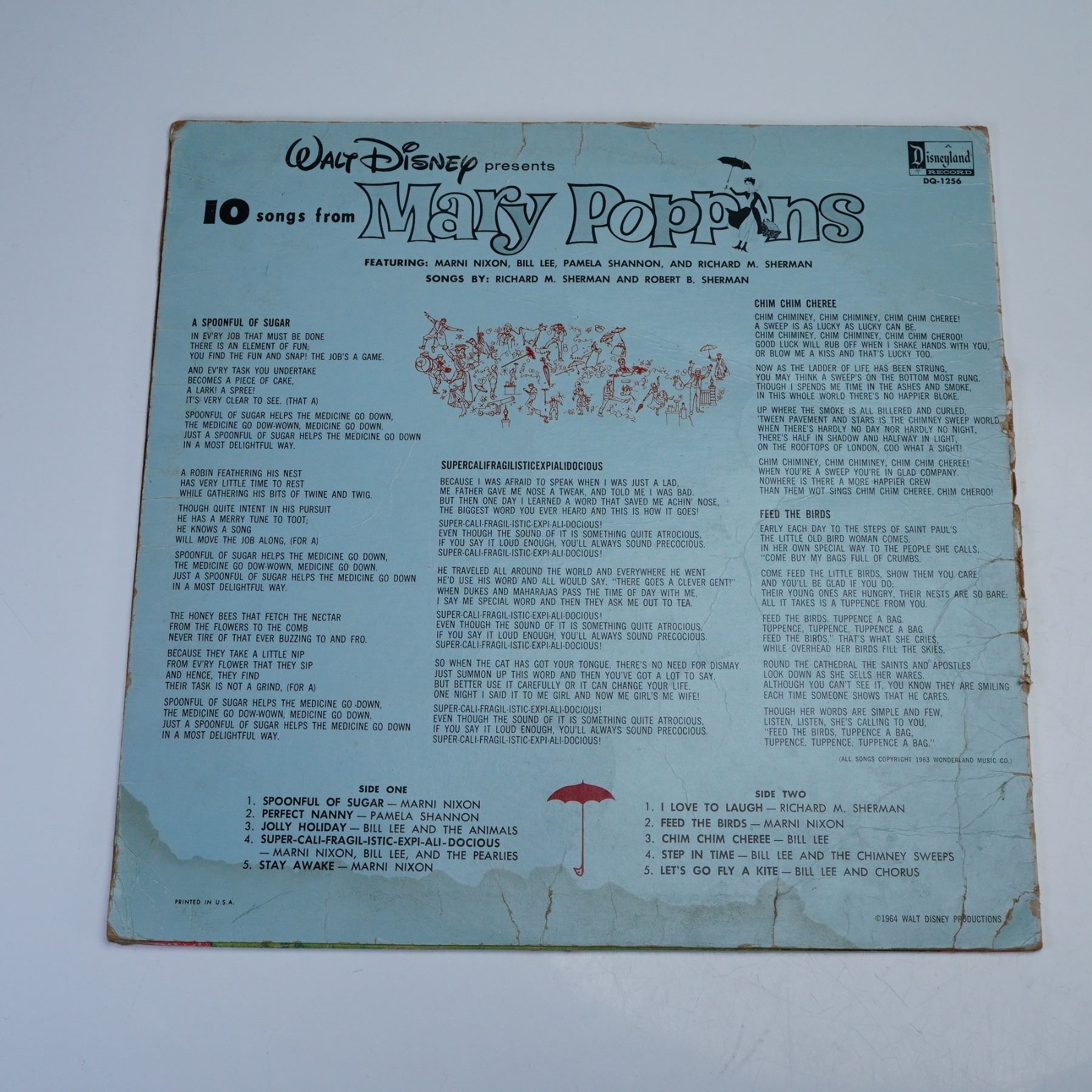A 12-inch long-playing vinyl record released by Disneyland Records, featuring ten selections from Walt Disney's Mary Poppins, performed by Marni Nixon, Bill Lee, Pamela Shannon, and Richard M. Sherman. This album presents beloved musical highlights composed by Richard M. Sherman and Robert B. Sherman, including "A Spoonful of Sugar," "Supercalifragilisticexpialidocious," "Chim Chim Cheree," and "Let's Go Fly a Kite." The disc is housed in a vibrant illustrated sleeve depicting scenes from the animated sequences of the film, with lyrics and credits printed on the reverse. Issued by Walt Disney Music Company.