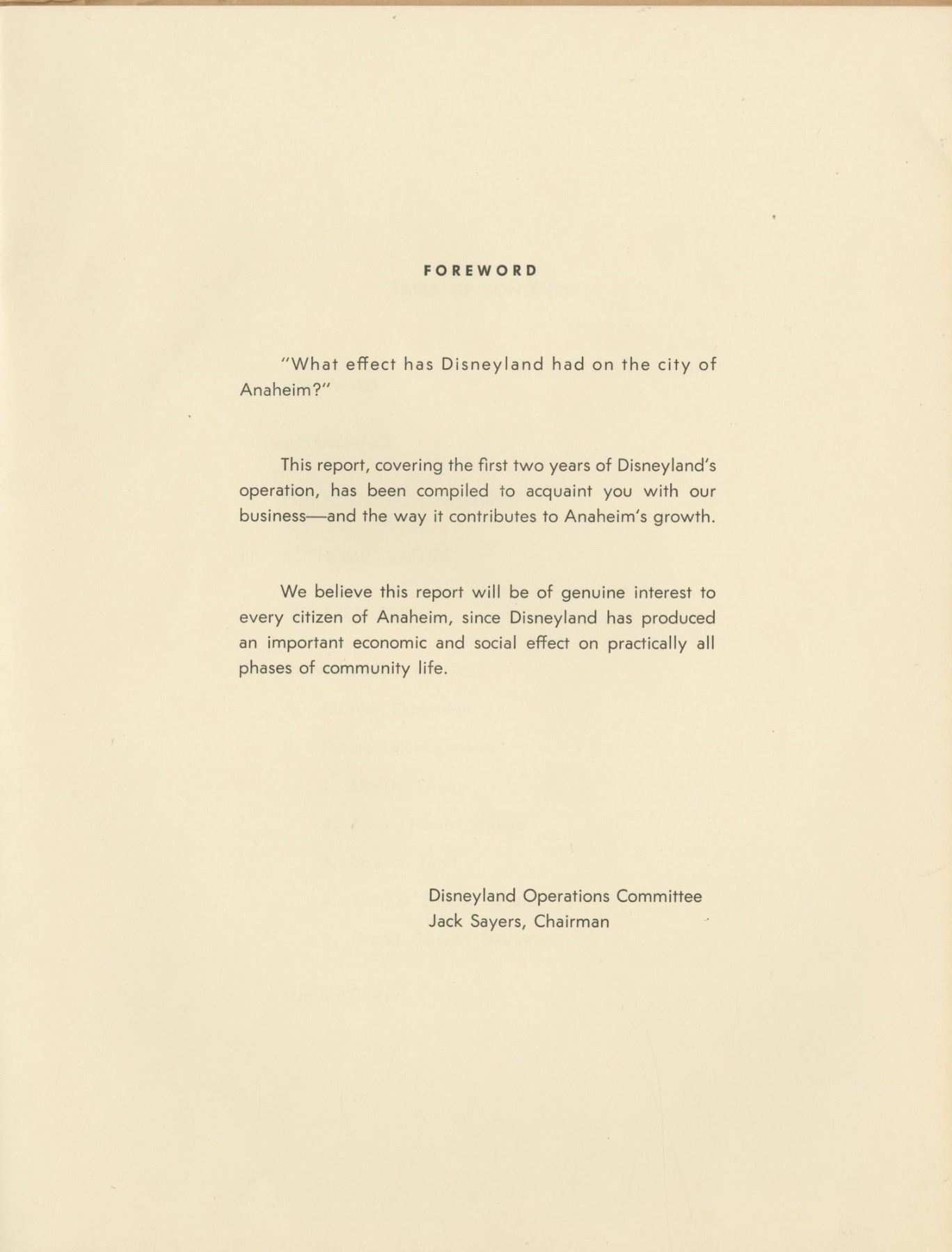 (Disneyland, 1957) An extremely rare 15-page summary of the first two years of Disneyland's operation, as well as a preview of the park's expansion plans. Created shortly after the end of the fiscal year in August of 1957, the report gives the city of Anaheim and its inhabitants an idea of Disneyland's effect on the surrounding community. Included are attendance figures, public opinion research, economic impact, employee information, and future expansion plans. Some of the future developments planned for 1960 include Liberty Street and the Hall of Presidents, New Orleans Square and the Haunted Mansion walk-through and Pirates of the Caribbean wax museum, Science Land, Thomas Edison Square, and the Grand Canyon Diorama. The 8.5"x11" booklet is in very good condition with discoloration to the cover and expected edge wear from use.