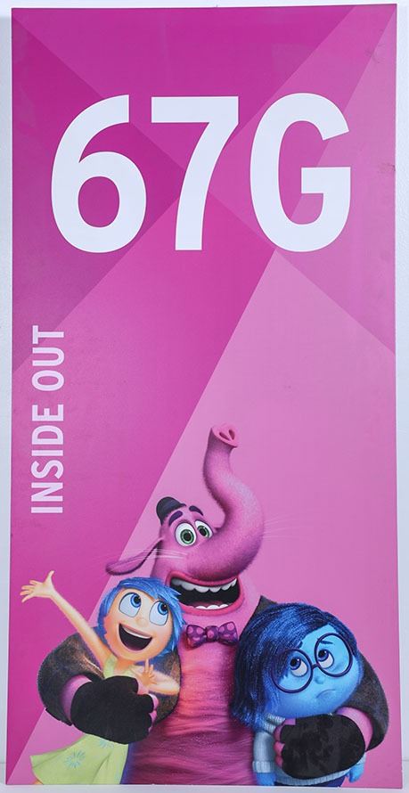(Disneyland Resort, c. 2000's). A Disneyland Resort park used prop sign featuring characters of Joy, Sadness and Bing Bong from the Disney Pixar film "Inside Out". Marked for parking lot section "67G." The sign is in good condition with normal wear from age and park use, and measures approximately 48" x 24" x 1/2". Item comes with a Grand Circle Tour Auctions COA.